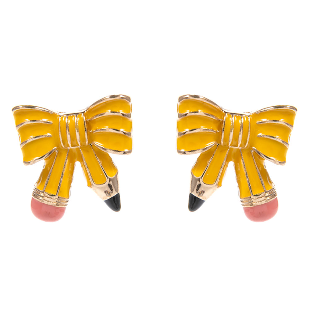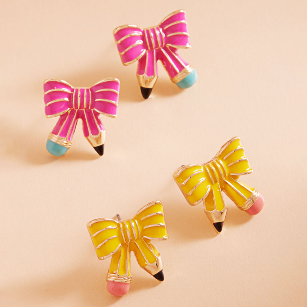Details • Size : 0.7" X 0.8" • Titanium Post Back • Adorable pencil bow stud earrings designed with a fun school-inspired look. Perfect for teachers, students, and themed outfits, these lightweight studs add a playful touch to any style. Great for gifting, classroom events, or everyday wear with a charming academic accent. • Lead and Nickel Compliant • Hypoallergenic