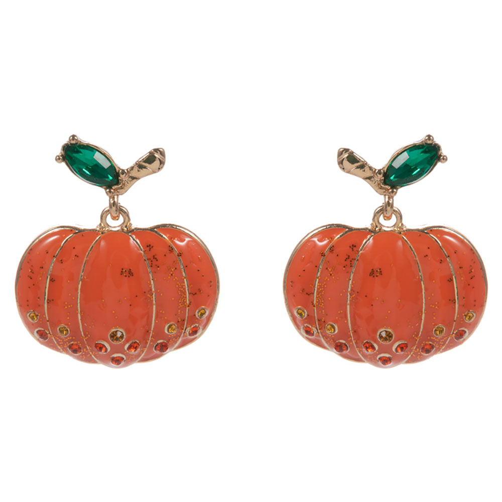 Details • Size : 0.8" X 0.75" • Titanium Post Back • Celebrate the spirit of the season with these charming pumpkin drop earrings, perfect for Halloween or fall festivities. Featuring a festive pumpkin design accented with sparkling details, they add a playful and stylish touch to your autumn wardrobe. • Hypoallergenic • Lead and Nickel Compliant