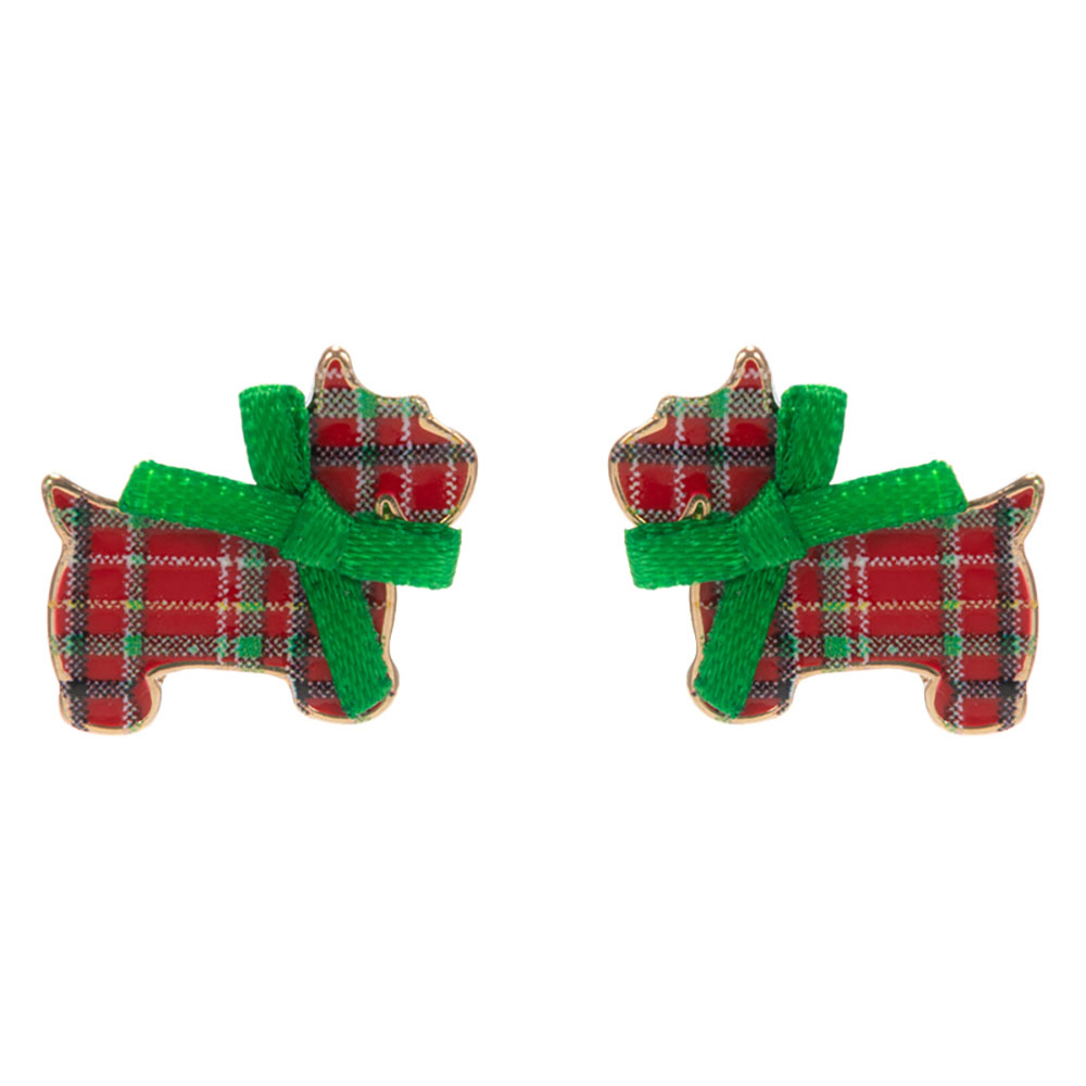 Details • Size : 0.8" X 0.7" • Titanium Post Back • Adorn your holiday style with plaid dog Christmas stud earrings featuring a festive bow. Perfect for holiday parties, gifting, or adding a cheerful seasonal touch to your jewelry collection. • Lead and Nickel Compliant • Hypoallergenic