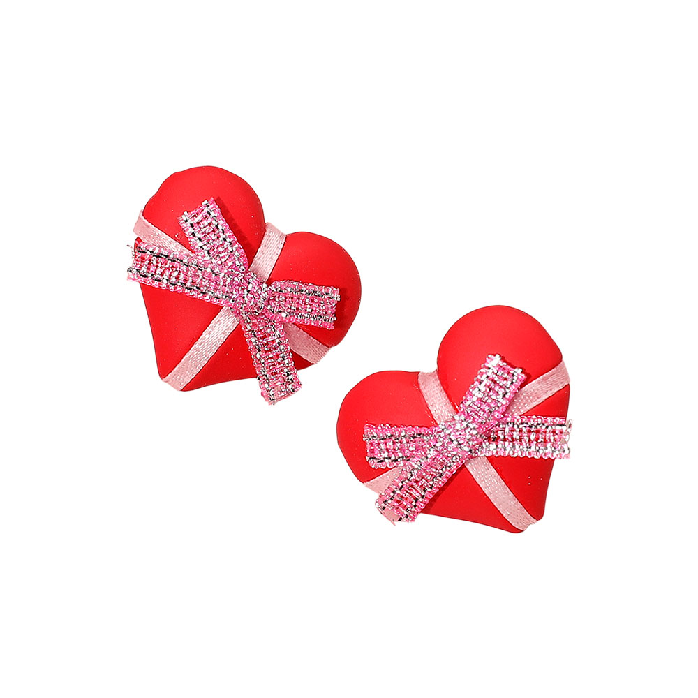 Details • Size : 0.9" X 0.8" • Post Back • Add playful charm to any outfit with these adorable heart-shaped stud earrings, topped with a glittery ribbon design. Perfect for casual looks, themed events, or gifting, they bring a fun and cheerful accent that brightens up your accessory collection with sweet, eye-catching detail. • Lead and Nickel Compliant