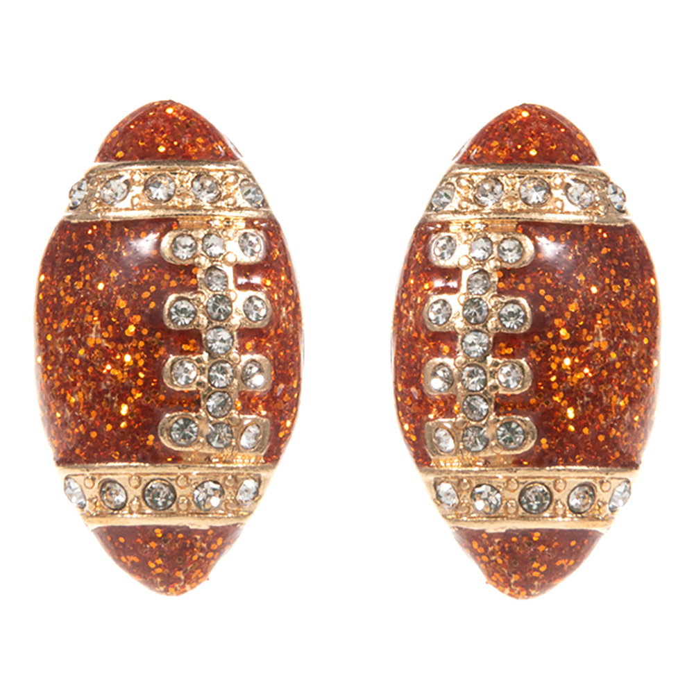Details • Size : 0.5" X 0.8" • Titanium Post Back • Game day ready football stud earrings featuring a glittery finish and sparkling rhinestone accents. Perfect for showing team spirit, these playful earrings add a bold statement to any sporty or festive outfit. • Hypoallergenic • Lead and Nickel Compliant