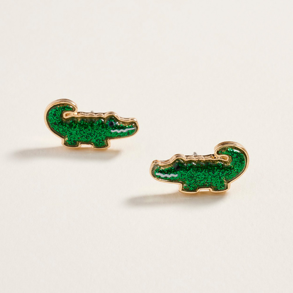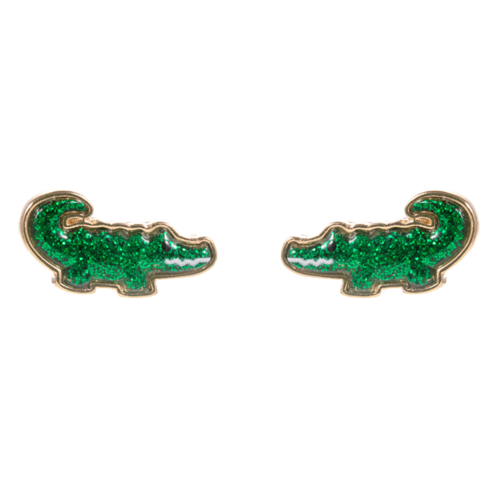 Details • Size : 0.8" X 0.4" • Titanium Post Back • Fun alligator stud earrings featuring a shimmering glitter finish for a playful, eye-catching look. Perfect for adding personality to casual outfits or themed events, these unique earrings bring charm and bold style, making them a standout accessory for any jewelry collection. • Hypoallergenic • Lead and Nickel Compliant