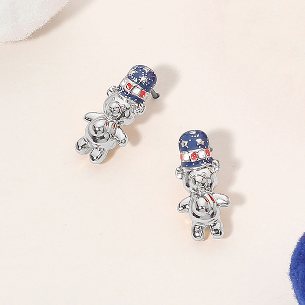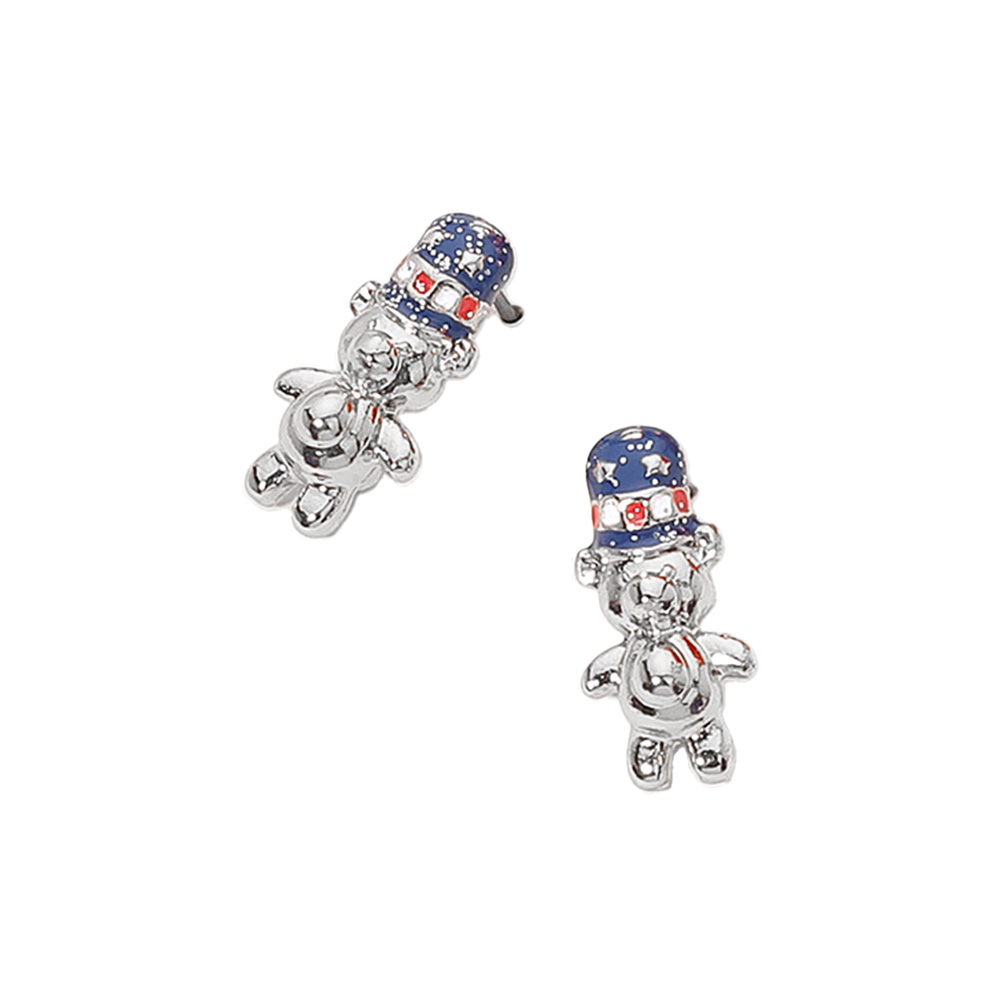 Glittered Enamel American USA Flag Top Hat Teddy Bear Stud Earrings