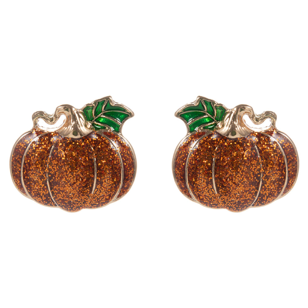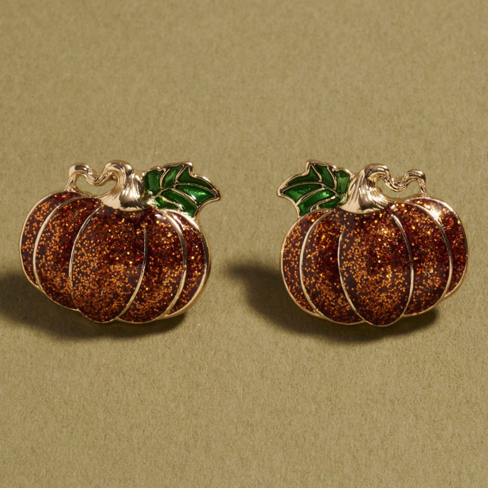 Details • Size : 0.8" X 0.7" • Titanium Post Back • Charming pumpkin-shaped stud earrings featuring a sparkling glitter finish and leaf detail. Ideal for fall outfits, Halloween events, or festive seasonal style. Playful and eye-catching accessory. • Lead and Nickel Compliant • Hypoallergenic
