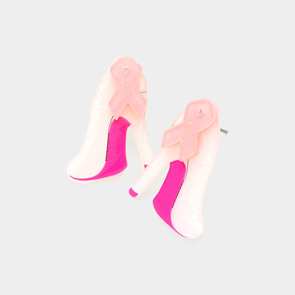 Glittered Pink Ribbon Pointed High Heel Stud Earrings