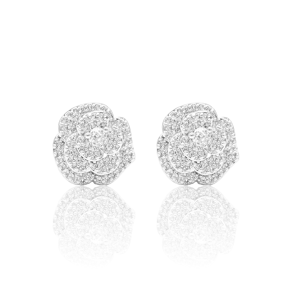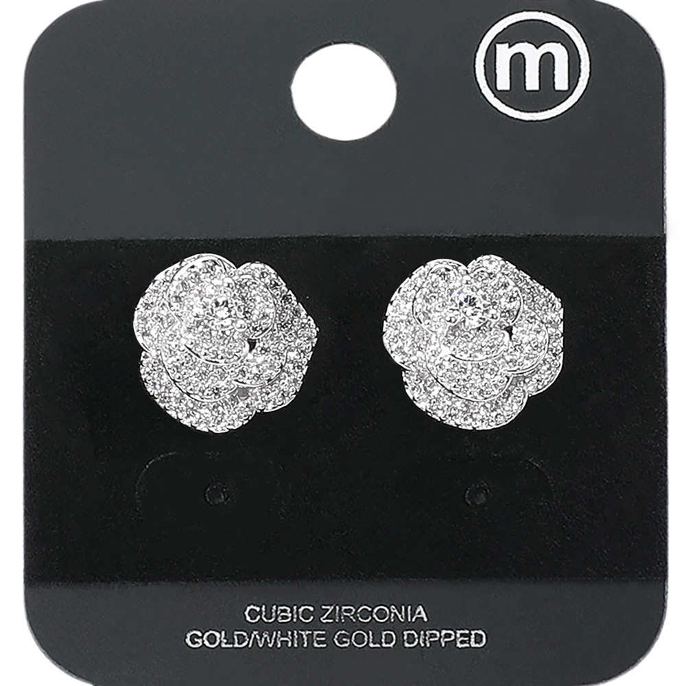 Details • Size : 0.5" X 0.5" • Post Back • Elegant rose-shaped stud earrings adorned with sparkling cubic zirconia and finished in gold-tone plating. A timeless floral design that brings charm and glamour to any outfit, day or night. • Lead and Nickel Compliant • Gold Dipped • CZ Cubic Zirconia