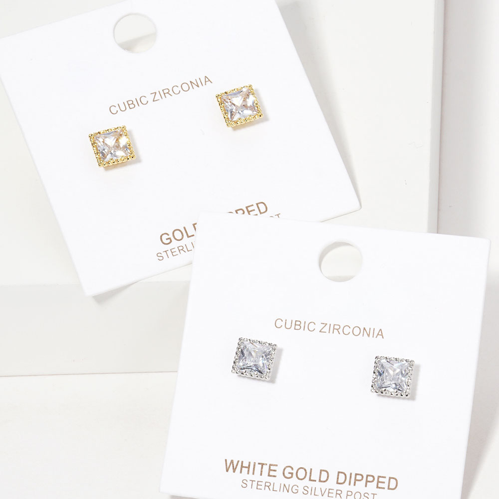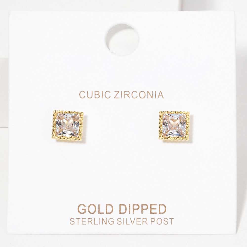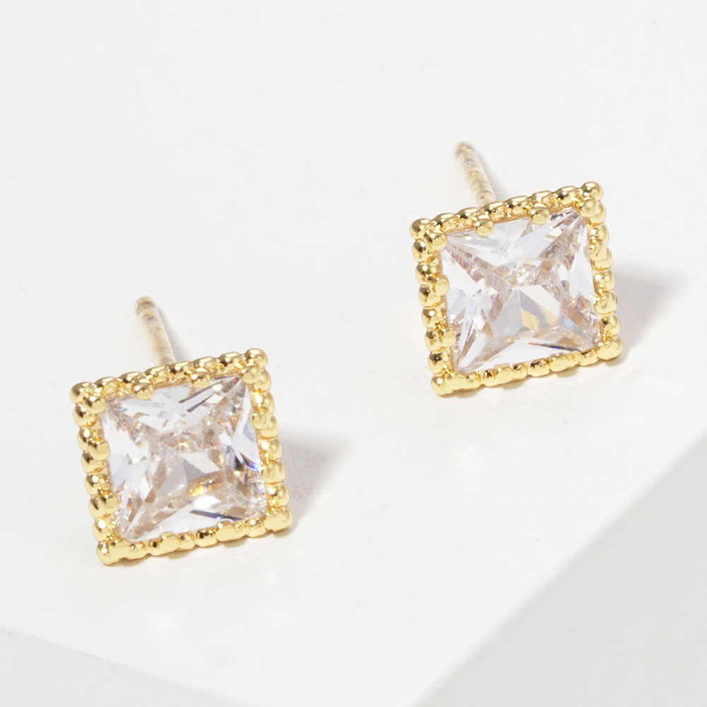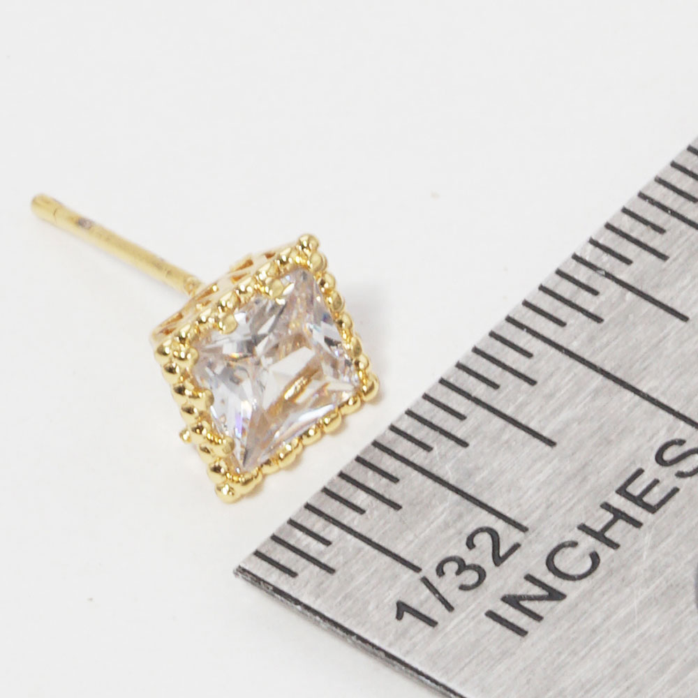 Details • Size : 0.25" X 0.25" • Post Back • Sophisticated square stud earrings featuring a princess-cut cubic zirconia crystal framed in a beaded edge. Perfect for adding refined sparkle to casual looks or evening wear with timeless elegance. • Lead and Nickel Compliant • Made In Korea • Gold Dipped • CZ Cubic Zirconia