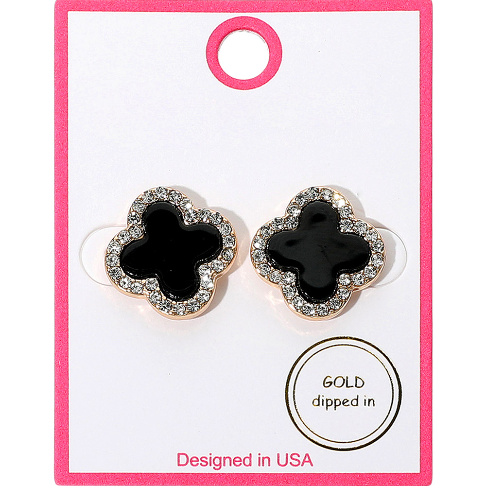 Details • Size : 0.7" X 0.7" • Post Back • Add a chic touch to your accessory collection with these elegant clover-shaped stud earrings. Outlined with sparkling rhinestones, the design blends timeless charm with contemporary flair—perfect for enhancing both everyday outfits and more refined ensembles. • Gold Dipped • Lead and Nickel Compliant