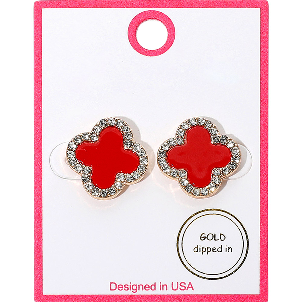 Gold Dipped Rhinestone Rim Quatrefoil Stud Earrings