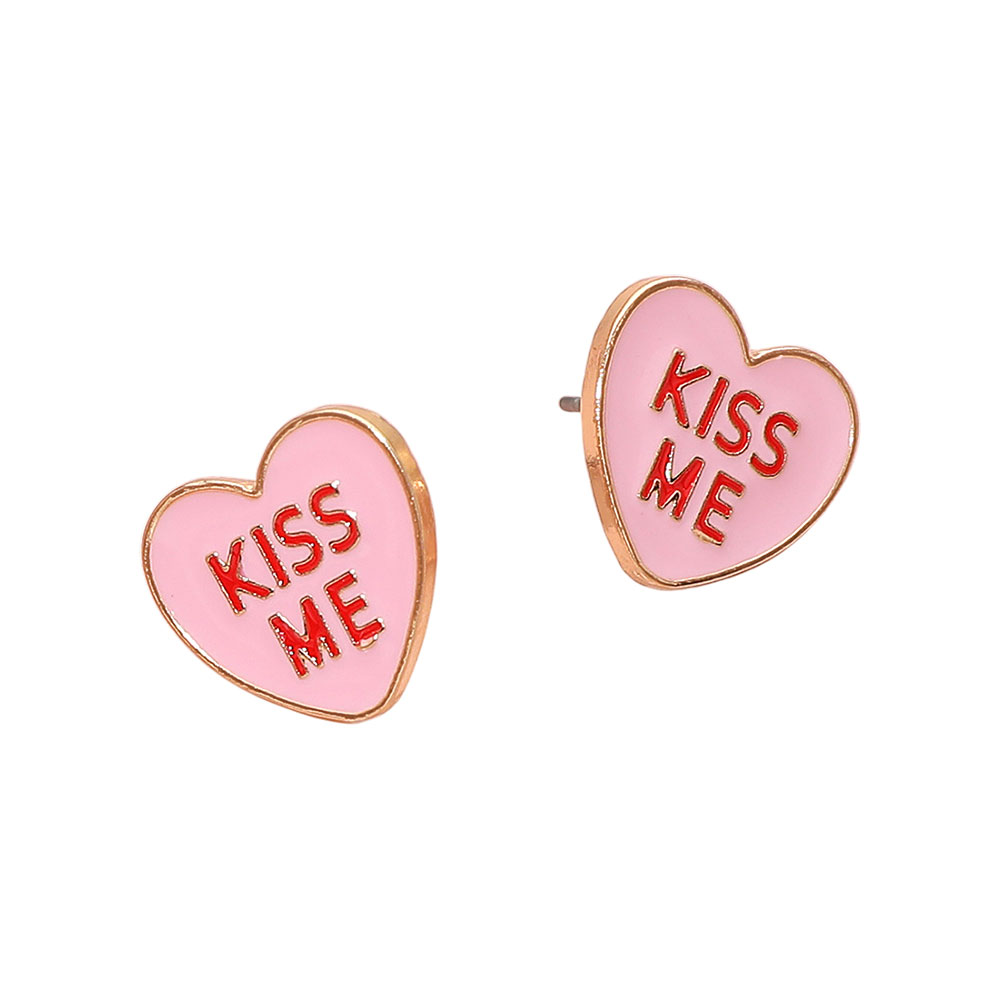 Details • Size : 0.6" X 0.6" • Post Back • Playful heart stud earrings featuring a bold “Kiss Me” motif in a clean, modern silhouette designed to stand out without overpowering your look. Ideal for everyday wear or flirty nights out, these lightweight studs add charm, personality, and a fun romantic accent to casual outfits or dressier styles. • Lead and Nickel Compliant