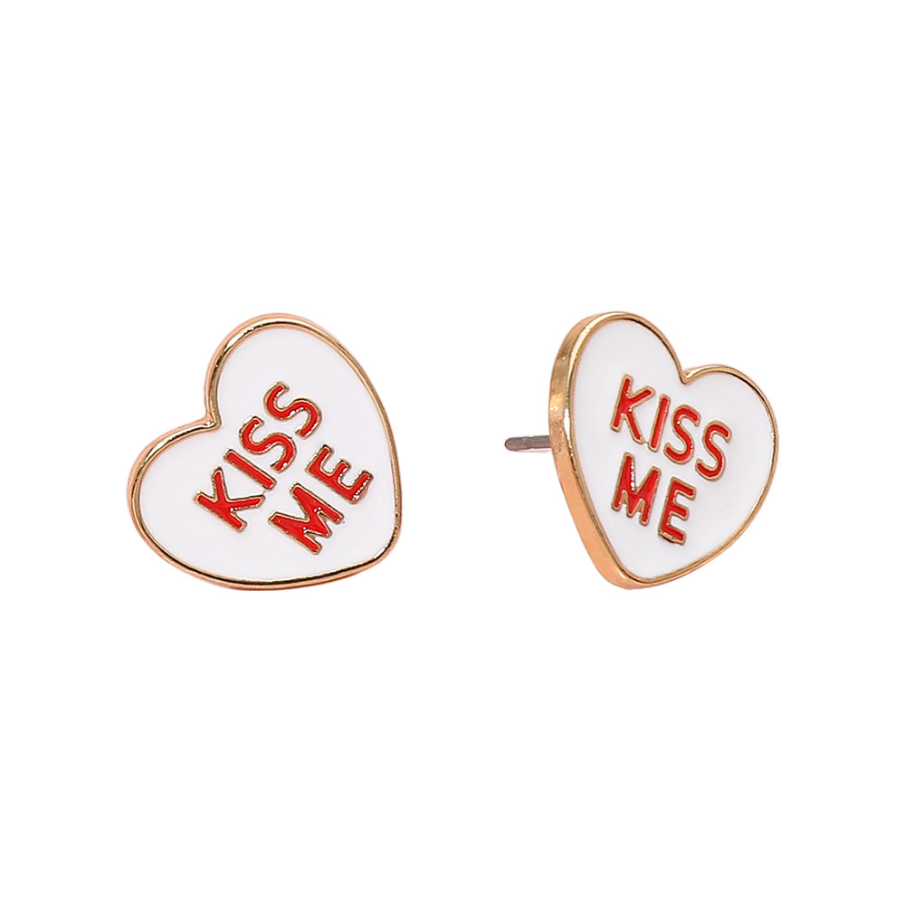 Details • Size : 0.6" X 0.6" • Post Back • Playful heart stud earrings featuring a bold “Kiss Me” motif in a clean, modern silhouette designed to stand out without overpowering your look. Ideal for everyday wear or flirty nights out, these lightweight studs add charm, personality, and a fun romantic accent to casual outfits or dressier styles. • Lead and Nickel Compliant