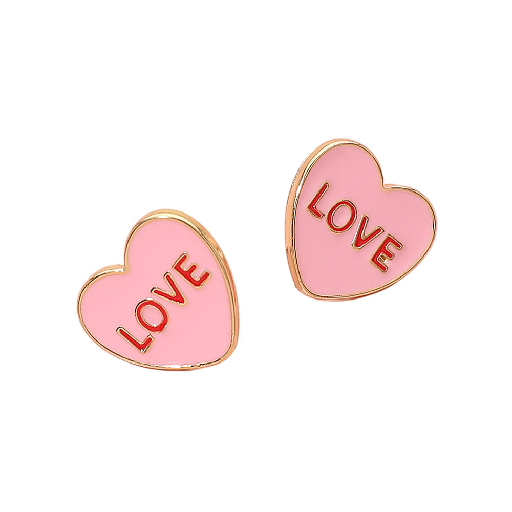 Details • Size : 0.6" X 0.6" • Post Back • Playful heart stud earrings featuring a bold LOVE motif with a sleek, modern silhouette that adds charm and personality to any outfit. Perfect for everyday styling or special moments, these lightweight statement studs bring a fun, romantic touch to both casual and dressed-up looks. • Lead and Nickel Compliant