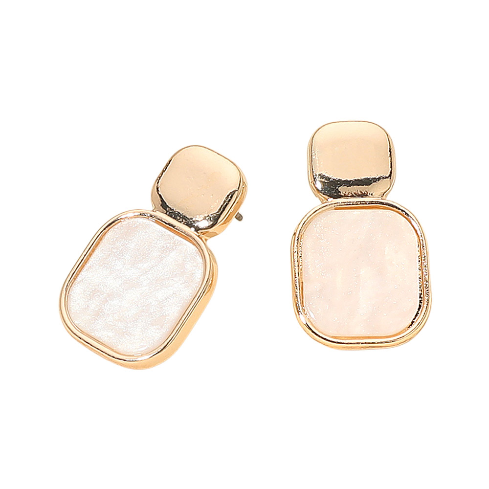 Details • Size : 0.5" X 0.9" • Post Back • These modern drop stud earrings feature a polished top element paired with an iridescent, softly textured accent for an elegant, contemporary look. Lightweight and versatile, they elevate everyday outfits or dressy ensembles with subtle shine and refined style. • Lead and Nickel Compliant