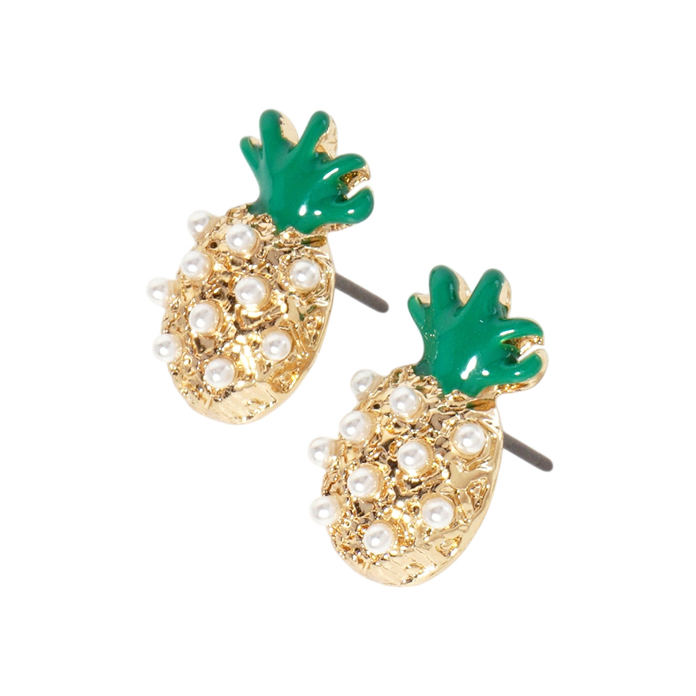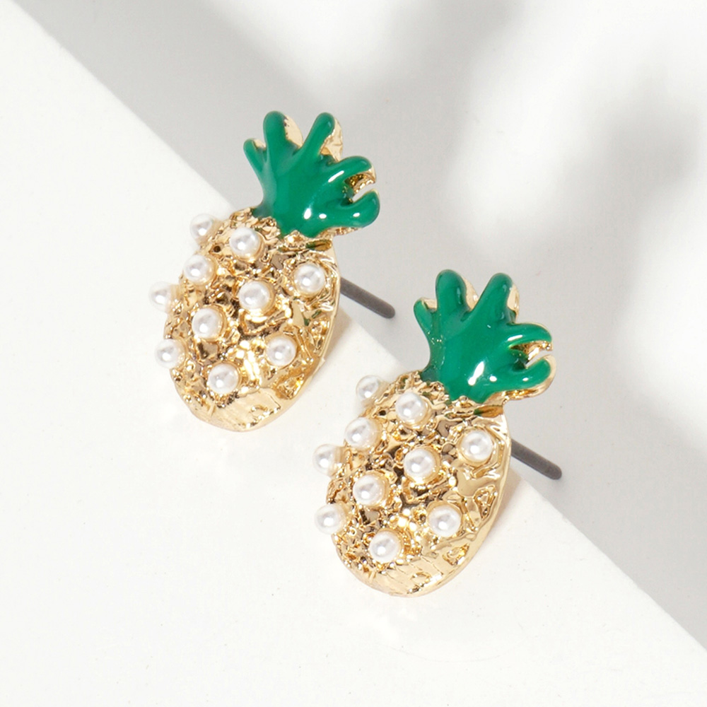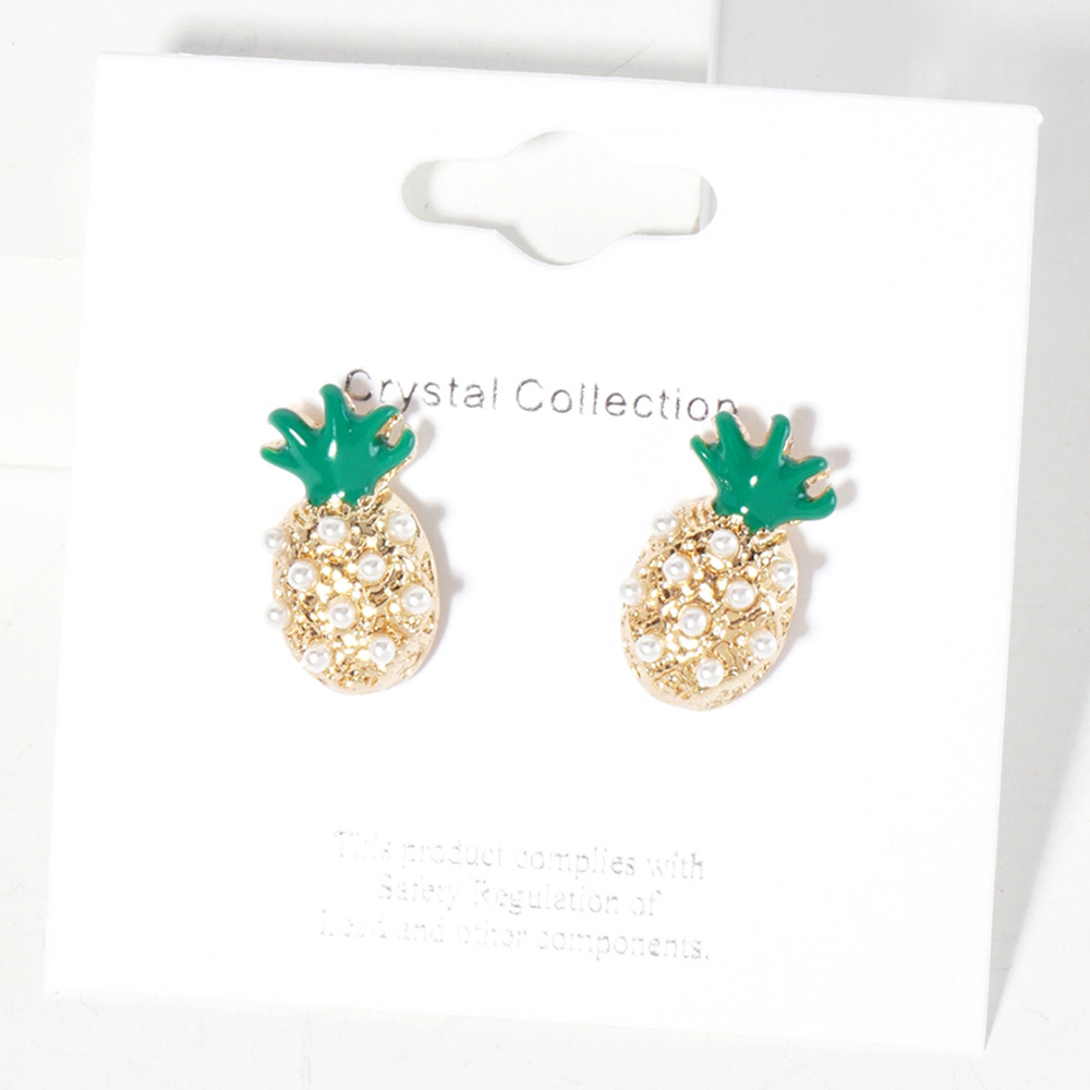 Details • Size : 0.4" X 0.6" • Post Back • Bring island vibes to your look with these sparkling pineapple stud earrings, featuring glistening pearl accents and vibrant top detail. Perfect for summer outfits, beach days, or playful accessorizing, they add a fruity pop of fun and charm to any jewelry collection. • Lead and Nickel Compliant