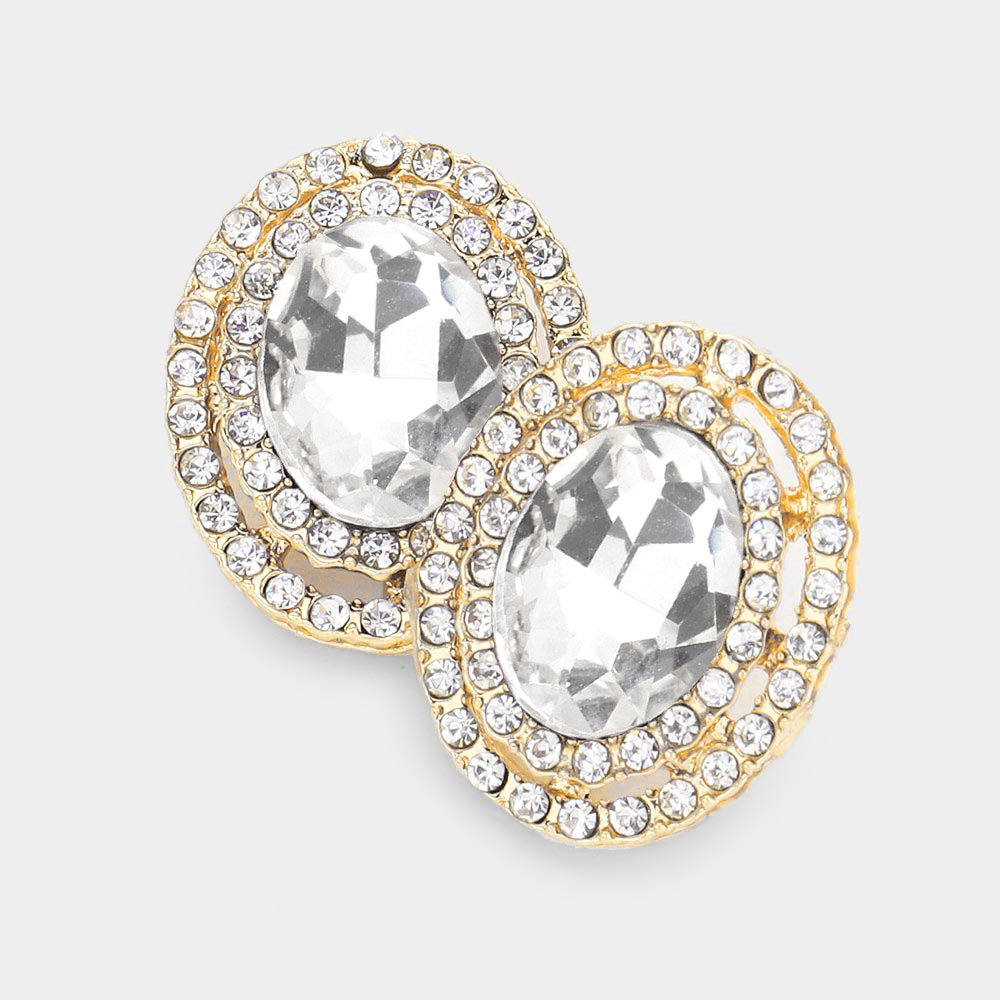 Rhinestone Trim Oval Stone Stud Evening Earrings