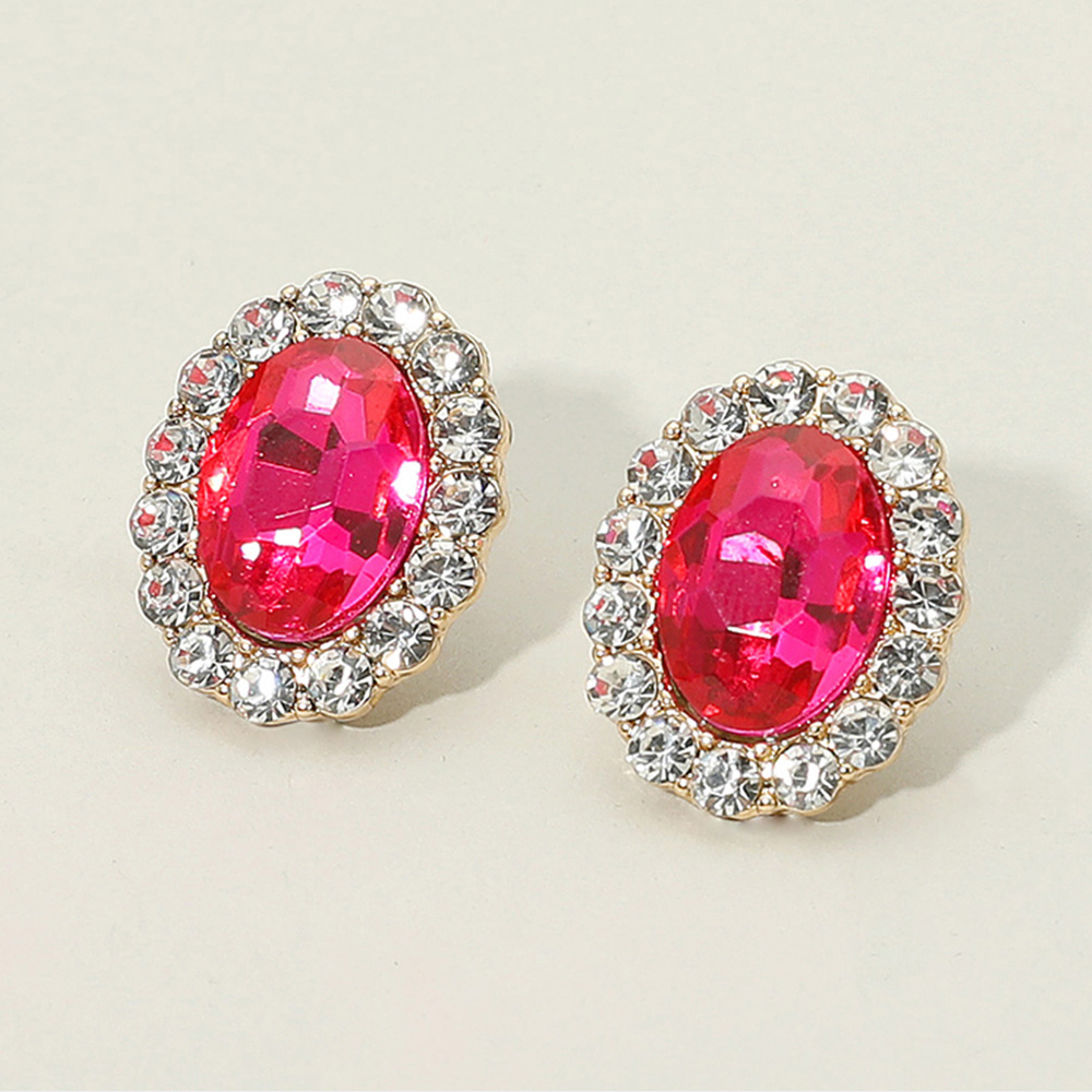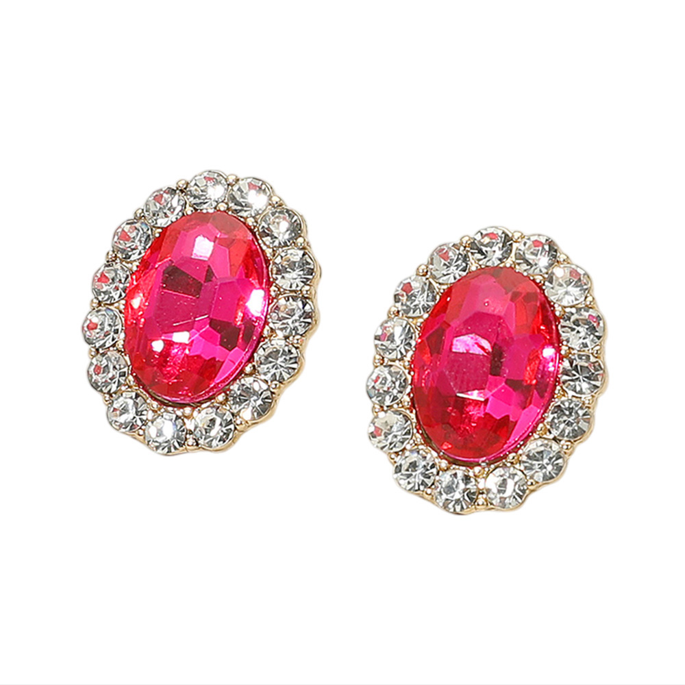 Details • Size : 0.7" X 0.8" • Post Back • Chic oval stud earrings featuring a vibrant crystal centerpiece surrounded by sparkling pink accents. Lightweight and radiant, they add a touch of glamour to casual outfits or evening looks. Perfect for gifting or accessorizing, these earrings bring timeless style and elegance to any jewelry collection. • Lead and Nickel Compliant