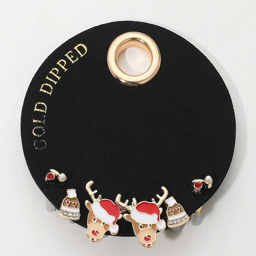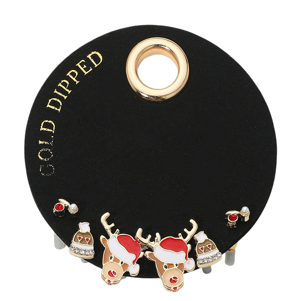 • Gold dipped earring set featuring adorable reindeer faces, sparkling holiday hats, and festive studs, perfect for celebrating the season with a touch of whimsical charm and joyful style.