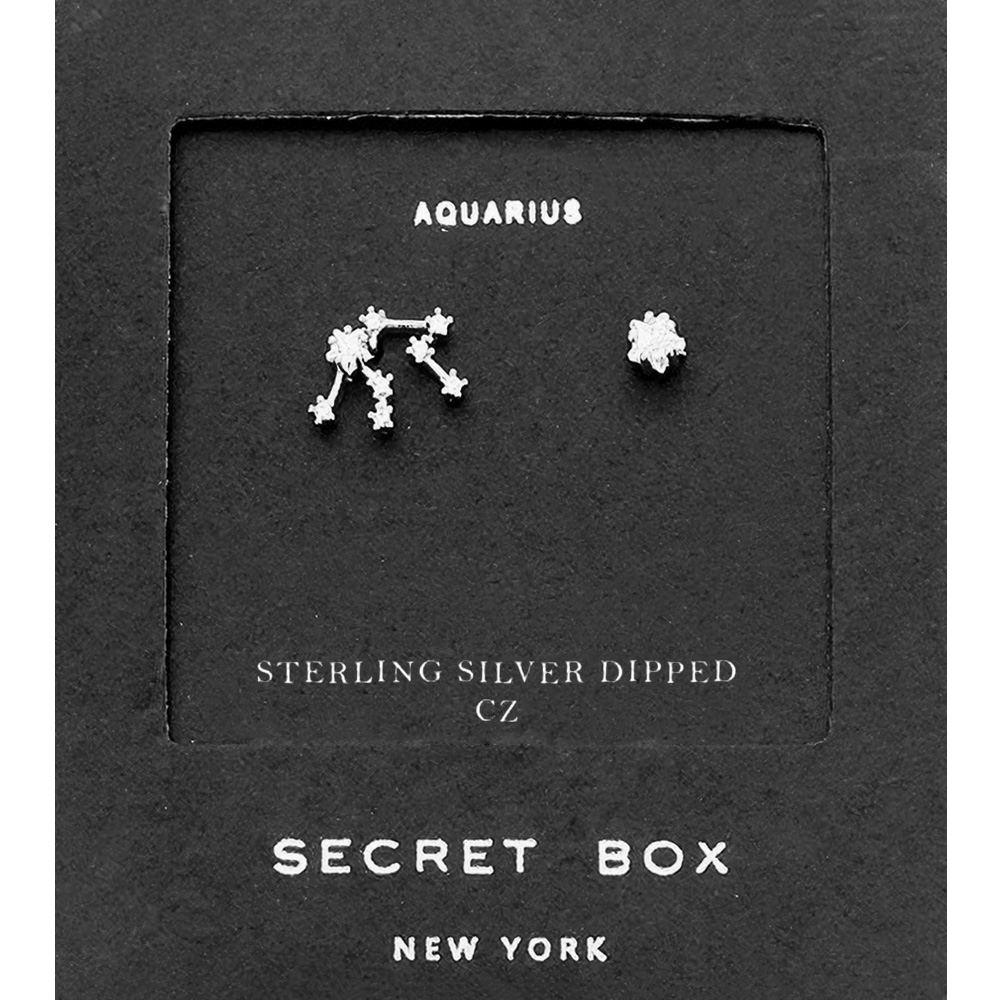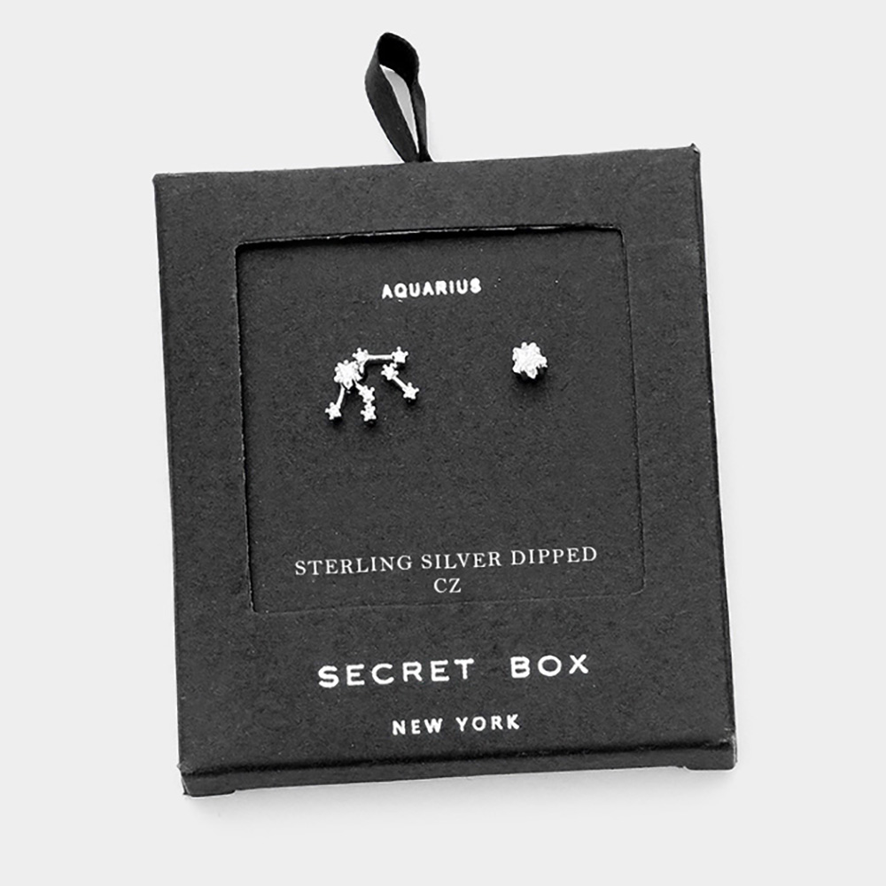 Secret Box_Sterling Silver Dipped CZ Stone Paved Aquarius Zodiac Sign Stud Earrings
