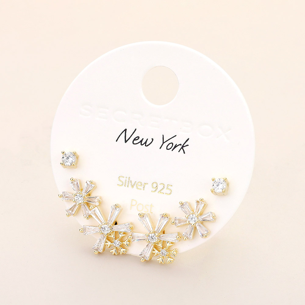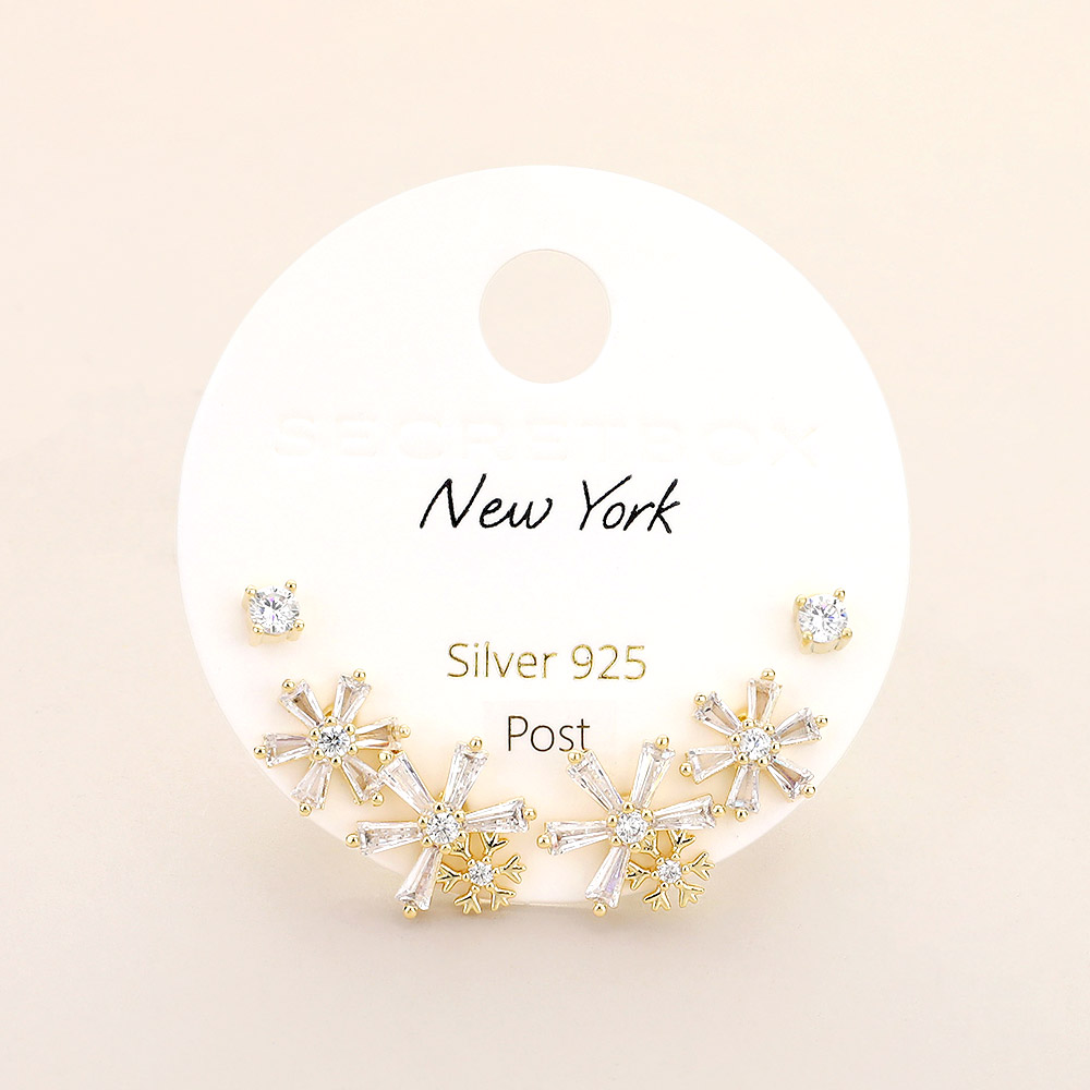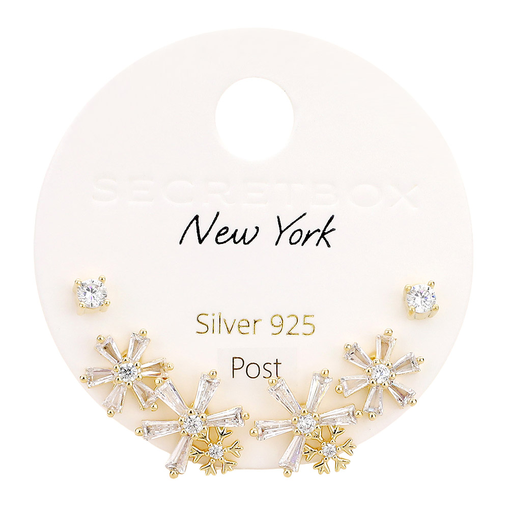 Details • Size : 0.2" L - 0.4" L • Post Back • Chic 3-pair earring set made with genuine 925 sterling silver. Includes elegant snowflake-inspired designs and classic round studs. Perfect for adding a festive sparkle to your look or gifting during the holiday season. Hypoallergenic and timeless. • Sterling Silver Post