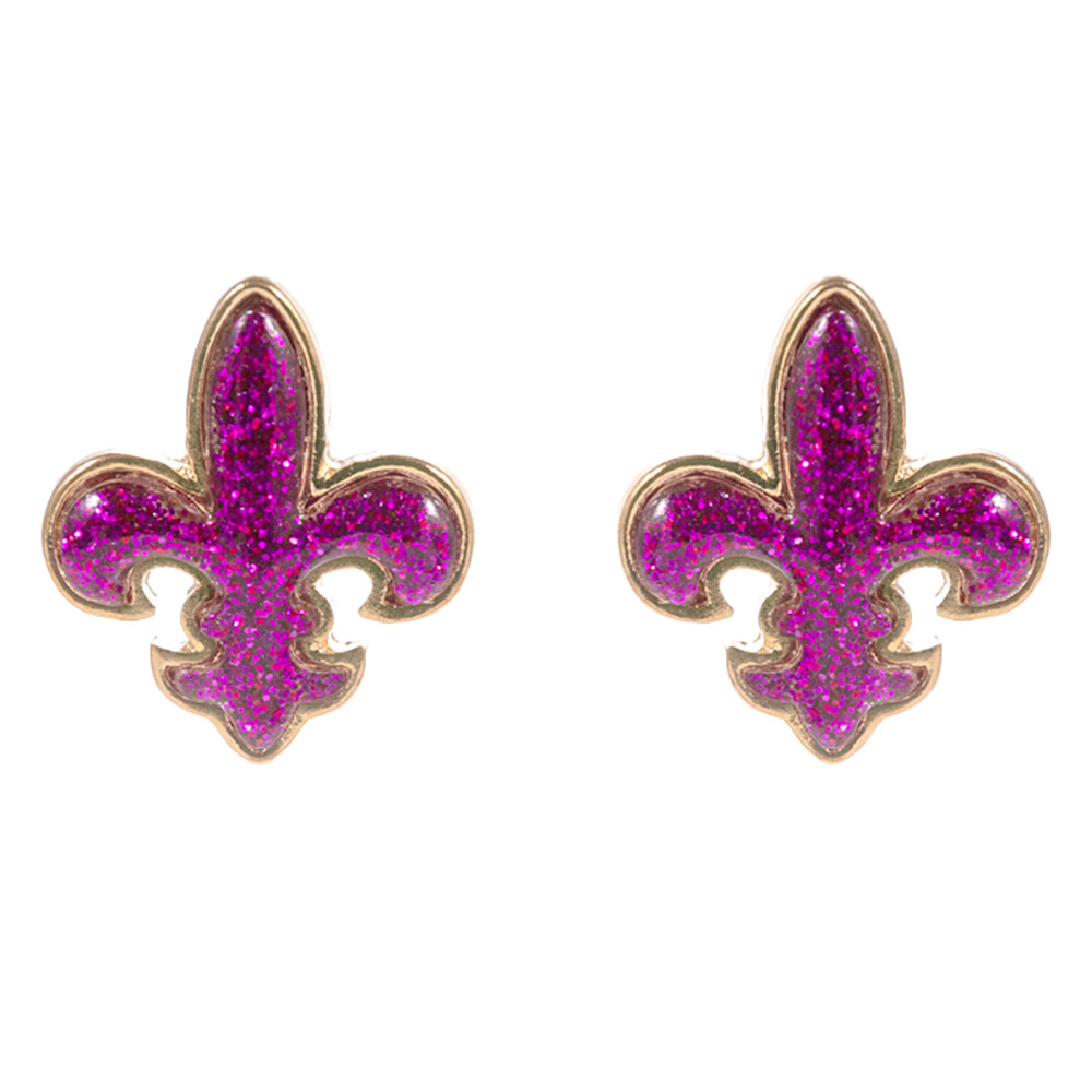 • Stylish fleur-de-lis stud earrings featuring a shimmering glitter accent for a festive and bold look. Perfect for celebrations, themed events, or everyday sparkle, these earrings bring charm and personality to any outfit, offering a unique touch of vibrant and elegant style.