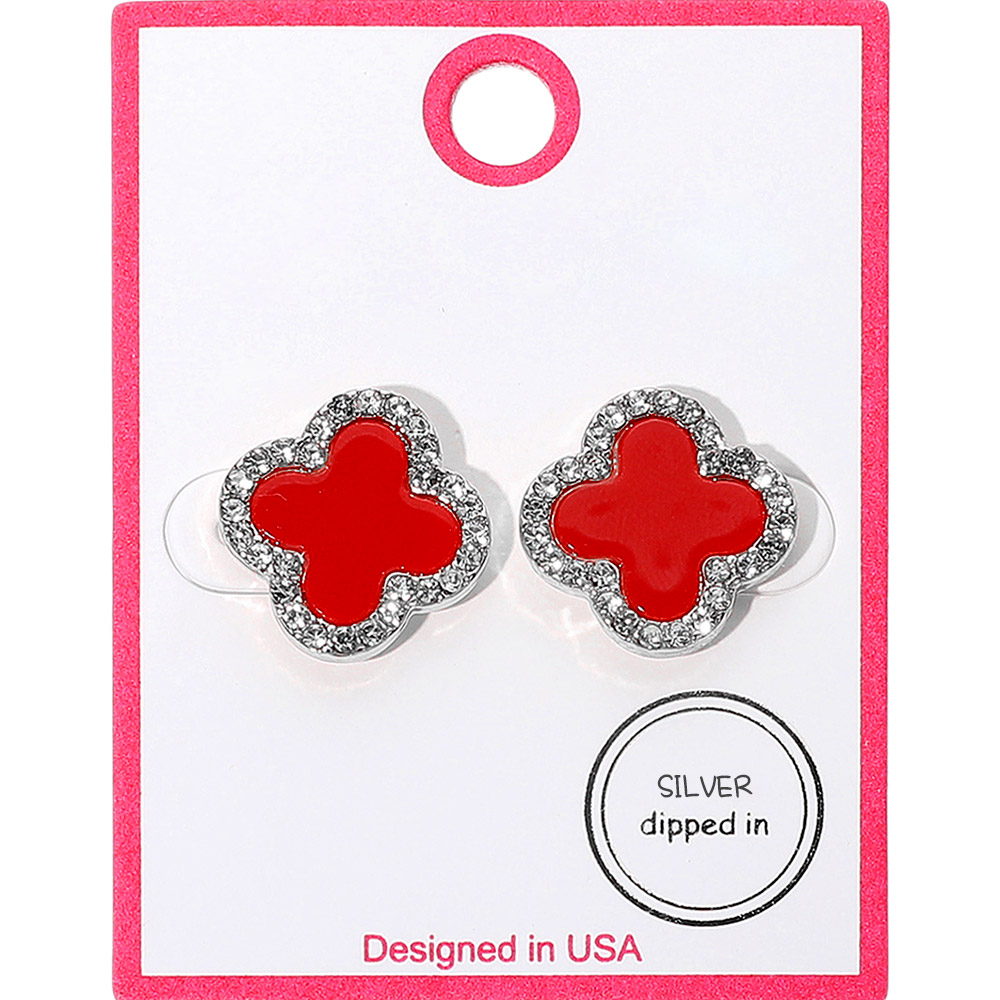 Details • Size : 0.7" X 0.7" • Post Back • Add a chic touch to your accessory collection with these elegant clover-shaped stud earrings. Outlined with sparkling rhinestones, the design blends timeless charm with contemporary flair—perfect for enhancing both everyday outfits and more refined ensembles. • Sterling Silver Dipped • Lead and Nickel Compliant