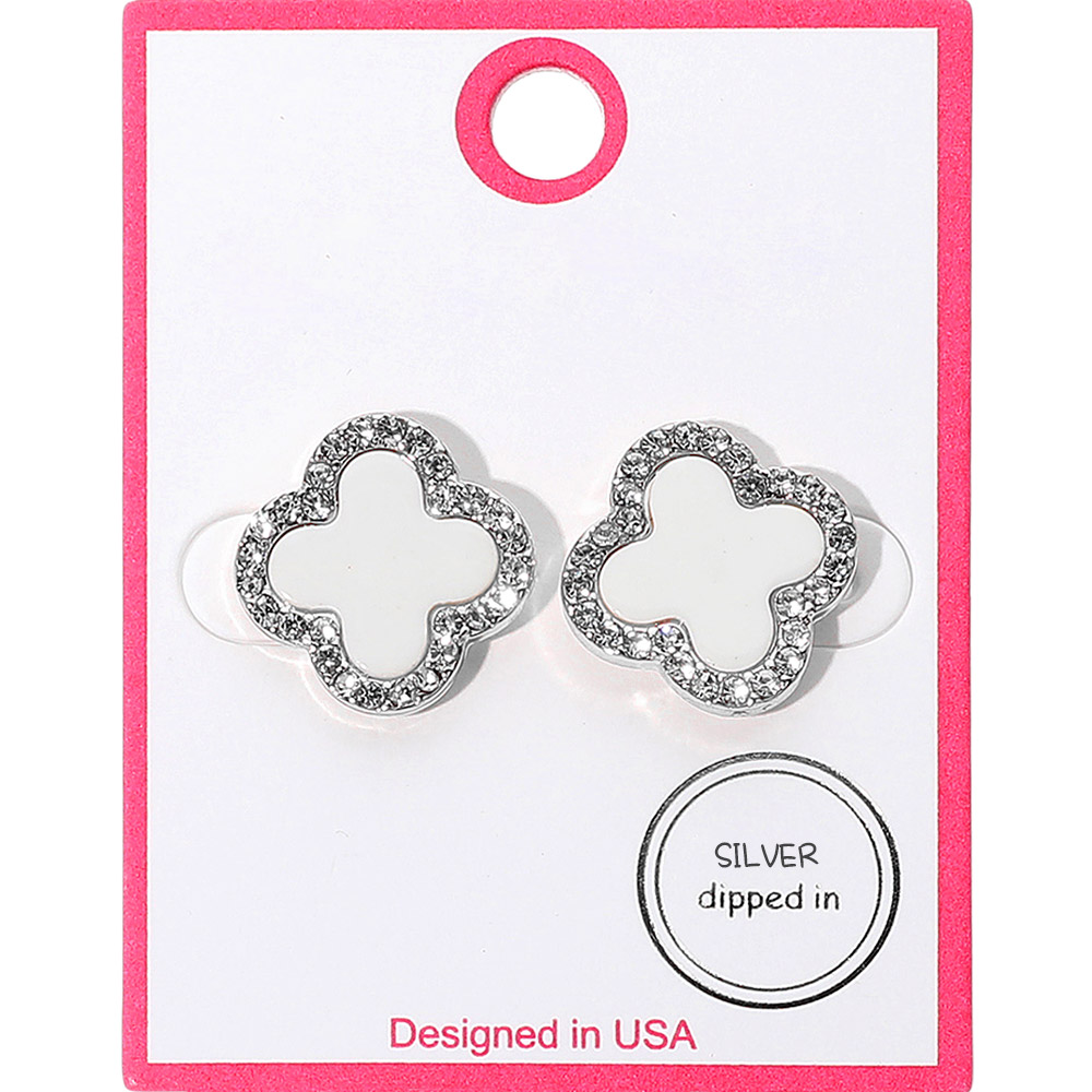 Details • Size : 0.7" X 0.7" • Post Back • Add a chic touch to your accessory collection with these elegant clover-shaped stud earrings. Outlined with sparkling rhinestones, the design blends timeless charm with contemporary flair—perfect for enhancing both everyday outfits and more refined ensembles. • Sterling Silver Dipped • Lead and Nickel Compliant
