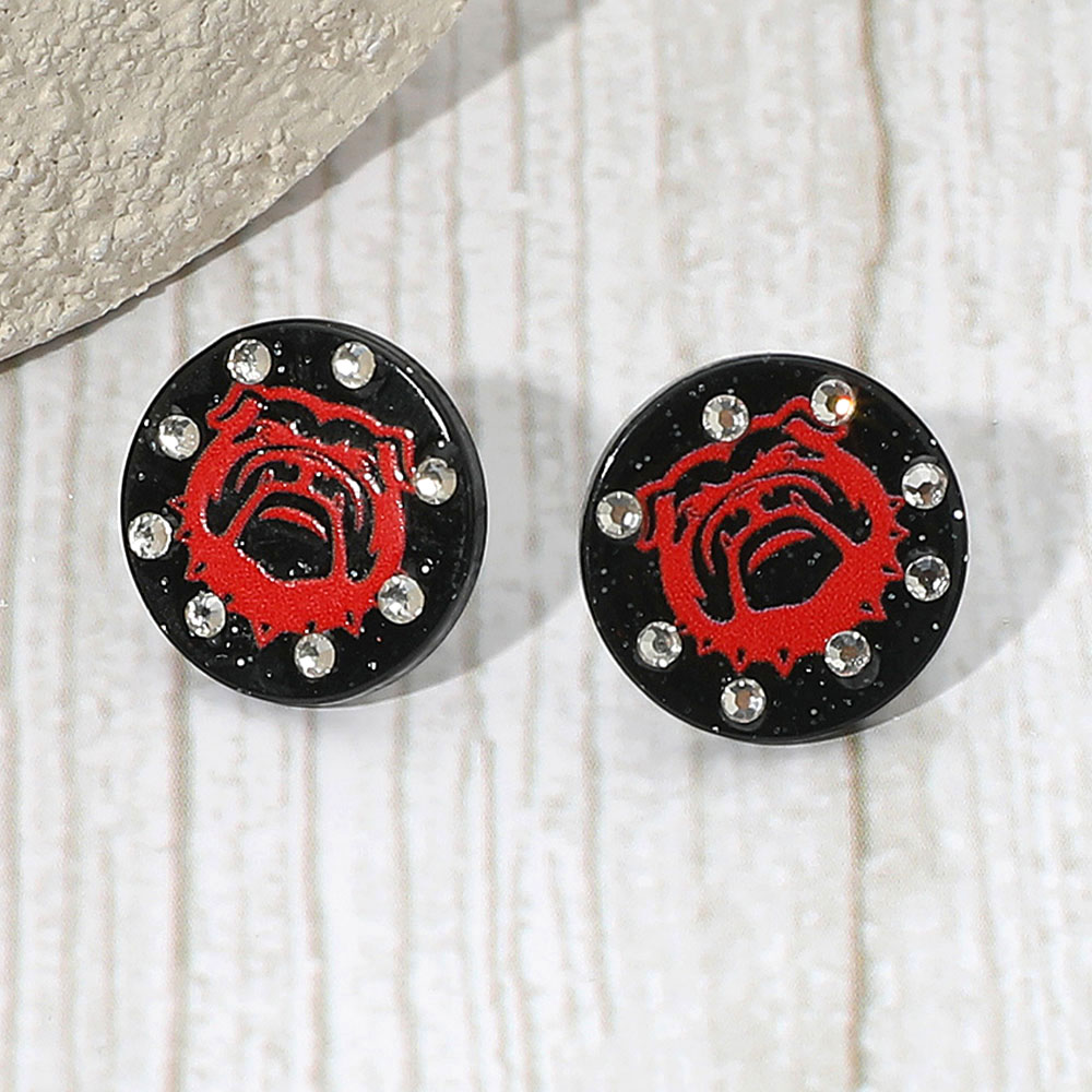 Details • Size : 0.7" X 0.7" • Post Back • Show off bold spirit with these round bulldog stud earrings, designed with a fierce graphic and glittering accents around the edge. Ideal for spirited looks or sporty vibes, they add a confident pop of personality to any outfit with their eye-catching design. • Lead and Nickel Compliant
