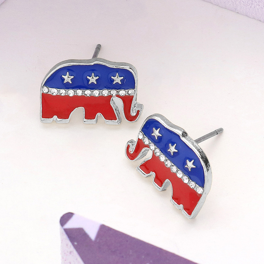 Stone Paved Enamel American USA Republican Elephant Stud Earrings