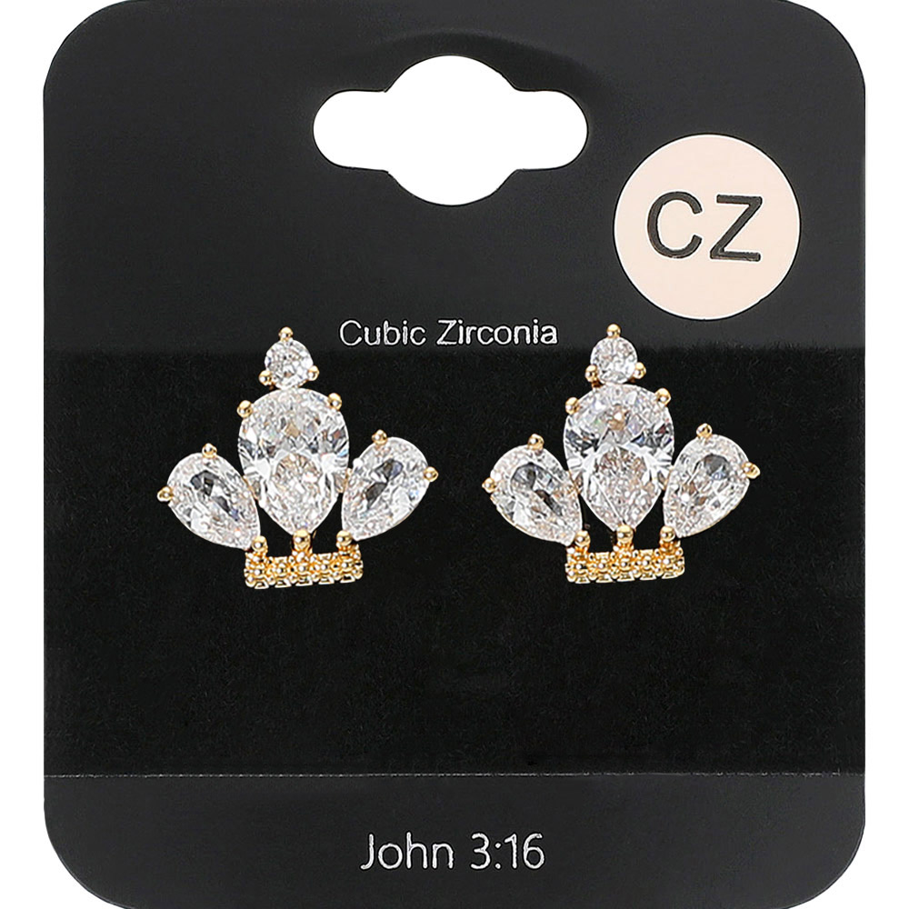 Details • Size : 0.6" X 0.6" • Post Back • These crown-inspired stud earrings feature dazzling cubic zirconia for a refined, sparkling look. A perfect blend of charm and elegance, ideal for everyday wear or special occasions. Adds a touch of brilliance to any jewelry collection. • Lead and Nickel Compliant • CZ Cubic Zirconia