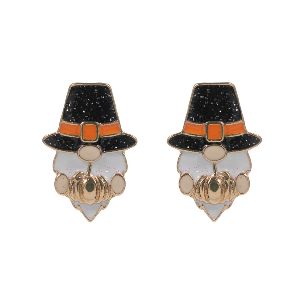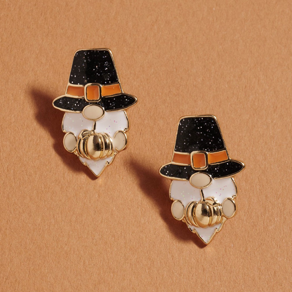 Details • Size : 0.75" X 1" • Titanium Post Back • Festive gnome stud earrings featuring a classic pilgrim hat and pumpkin detail. A whimsical accessory to celebrate Thanksgiving with seasonal charm and playful holiday style. • Hypoallergenic • Lead and Nickel Compliant