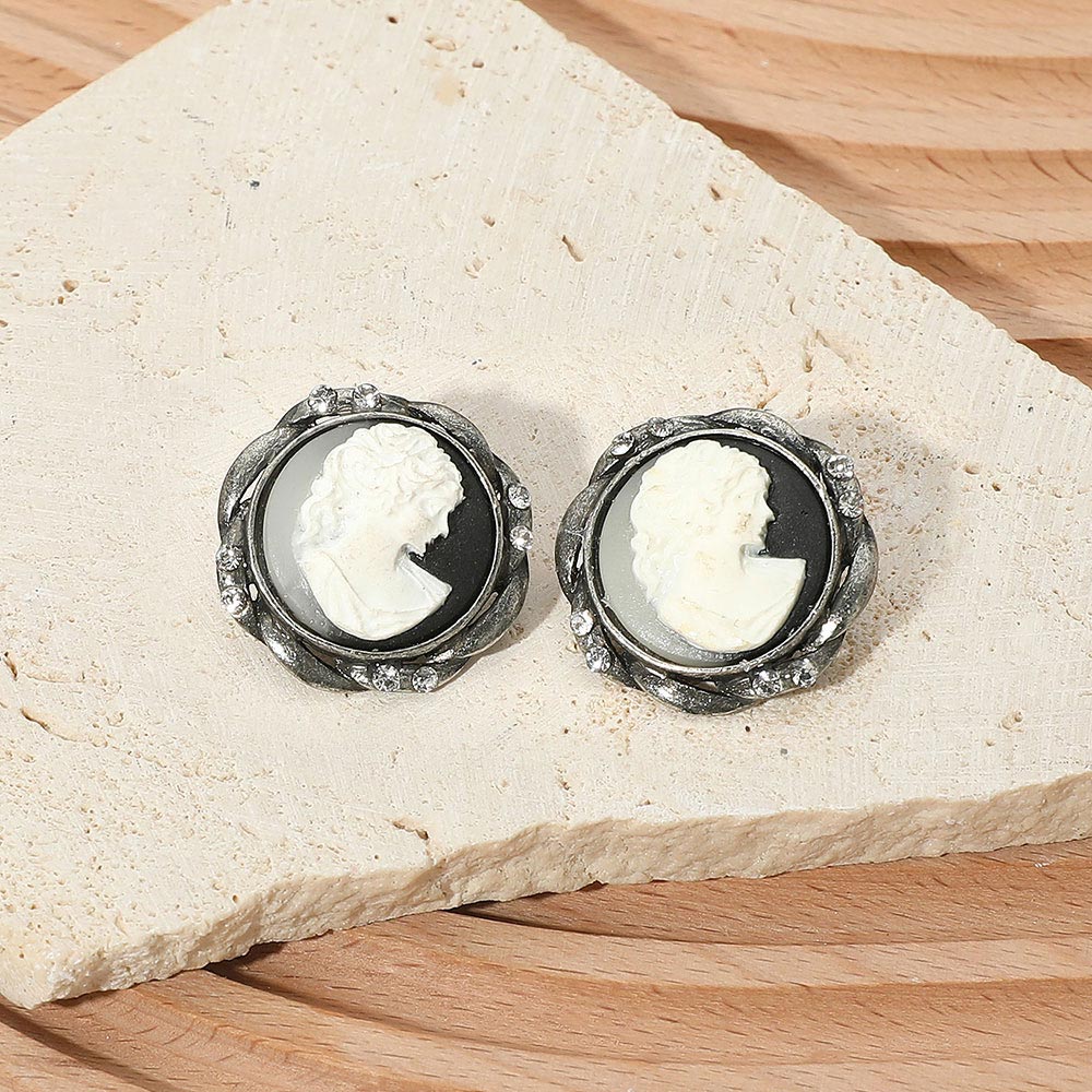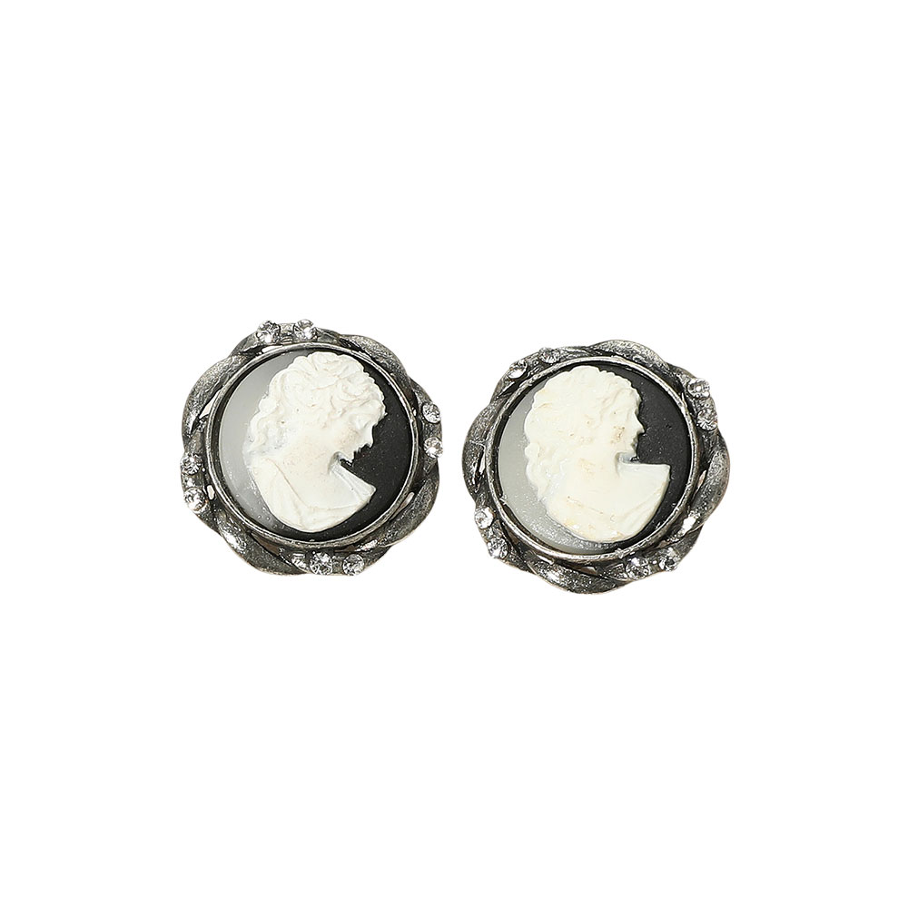 • Charming vintage-inspired cameo stud earrings showcasing classic profile portraits framed with sparkling rhinestones. These timeless earrings add elegance to everyday wear or special occasions, offering a sophisticated touch to any jewelry collection.