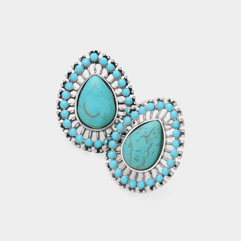 Details • Size : 0.8" X 1" • Post Back • Teardrop stud earrings with vibrant turquoise stones and beaded silver trim. A bold yet classic accent for boho and Southwestern styles. • Lead and Nickel Compliant