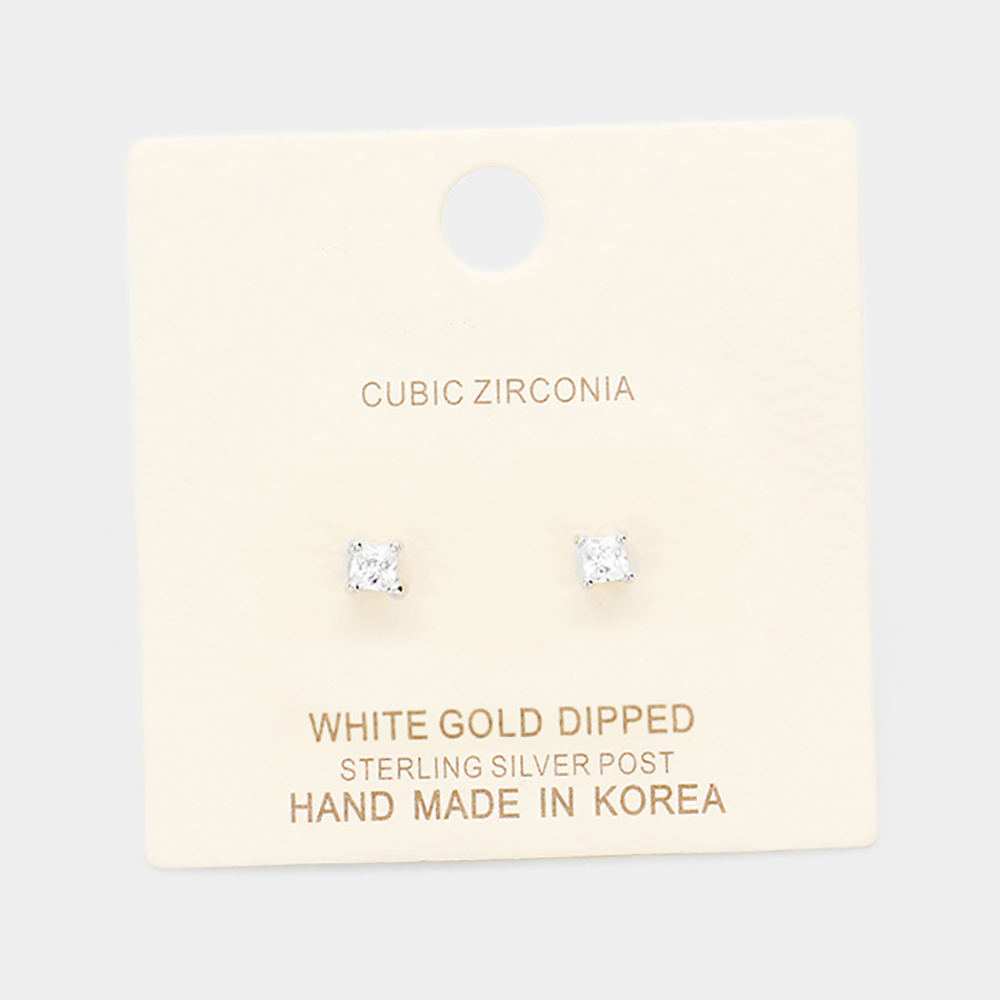 White Gold Dipped 3mm Cubic Zirconia Square Stud Earrings