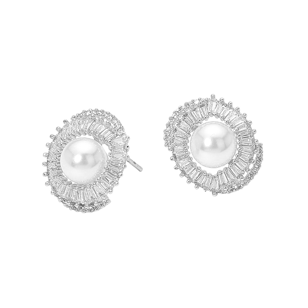 Details • Size : 0.6" X 0.7" • Post Back • Sophisticated stud earrings featuring a luminous pearl center surrounded by a radiant halo of sparkling CZ baguettes. Their timeless elegance makes them perfect for weddings, evening events, or daily sophistication, offering a refined accessory that enhances any look with classic charm. • Brass • CZ Cubic Zirconia • Gold Dipped • Hypoallergenic • Lead and Nickel Compliant • Made In Korea