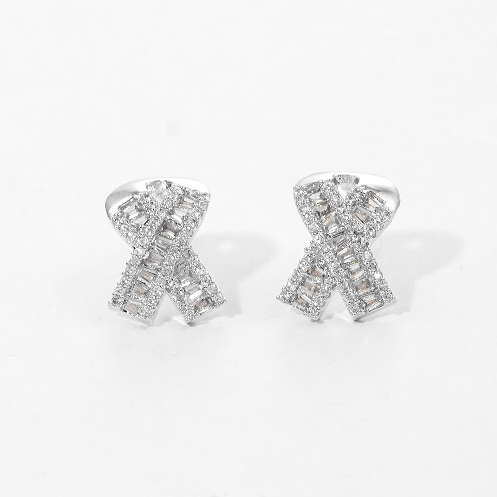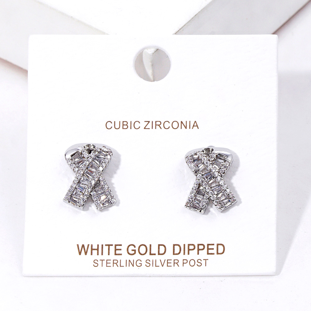 White Gold Dipped CZ Pink Ribbon Stud Earrings