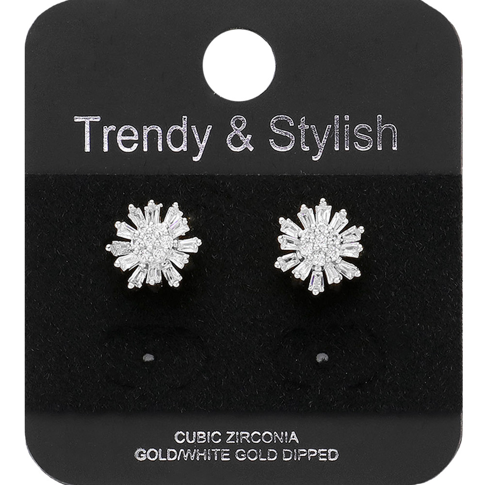 White Gold Dipped CZ Stone Embellished Flower Stud Earrings