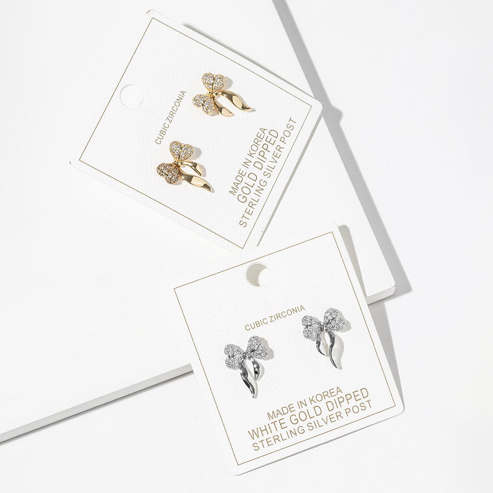 Details • Size : 0.5" X 0.75" • Delicate bow accent stud earrings featuring sparkling cubic zirconia details and a graceful drop silhouette. Designed to add a touch of charm and elegance to everyday looks or special occasions, these studs pair beautifully with casual outfits, dresses, and layered ear styling for a polished finish. • CZ Cubic Zirconia • Gold Dipped • Lead and Nickel Compliant • Made In Korea • Sterling Silver Post