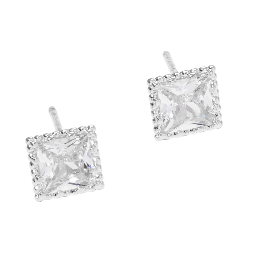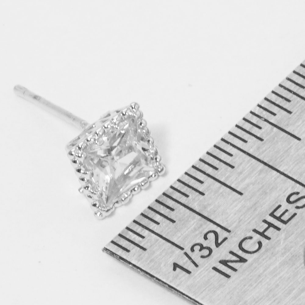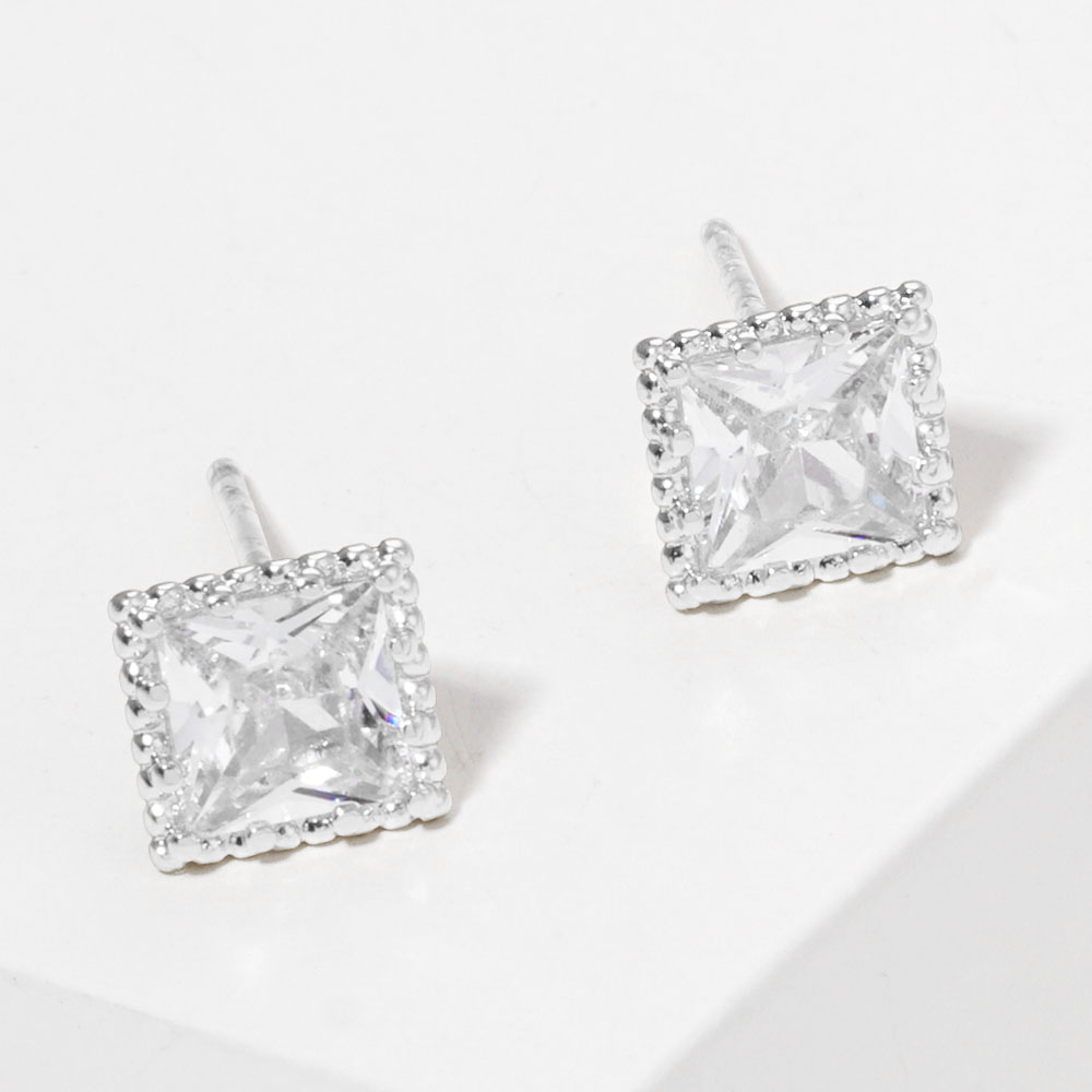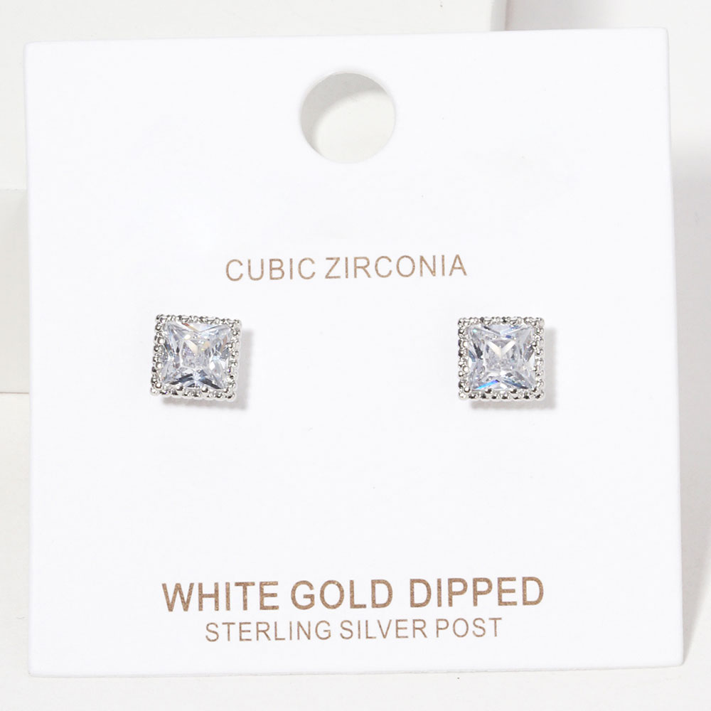 Details • Size : 0.25" X 0.25" • Post Back • Sophisticated square stud earrings featuring a princess-cut cubic zirconia crystal framed in a beaded edge. Perfect for adding refined sparkle to casual looks or evening wear with timeless elegance. • Lead and Nickel Compliant • Made In Korea • Gold Dipped • CZ Cubic Zirconia