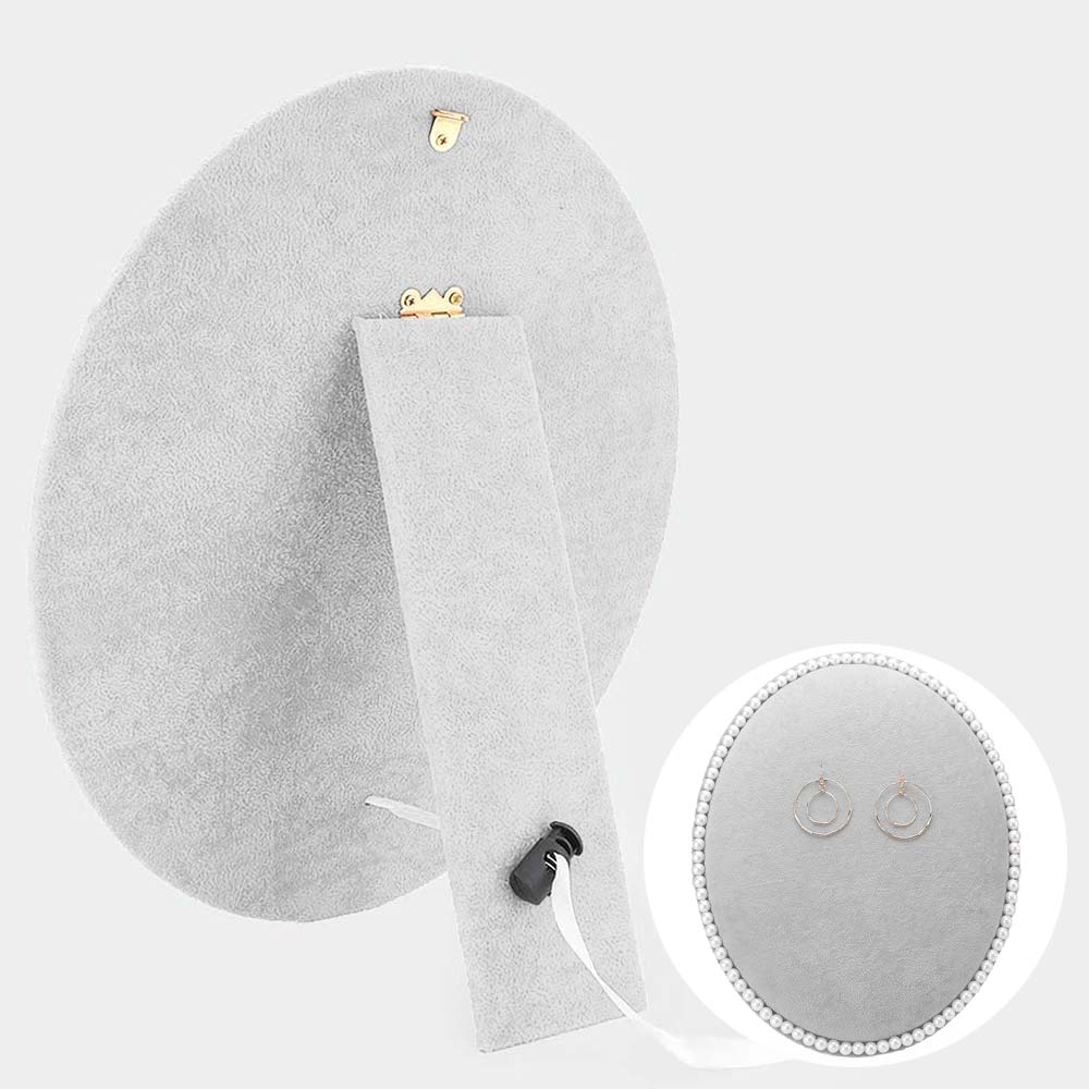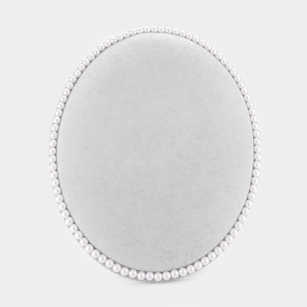 Details • Size : 10" X 12.5" • Earrings not included • Elegant oval jewelry display pad with pearl-accented trim and plush velvet surface. Perfect for showcasing rings, earrings, or brooches in a refined and professional presentation. Adds charm and sophistication to counters or photo setups.