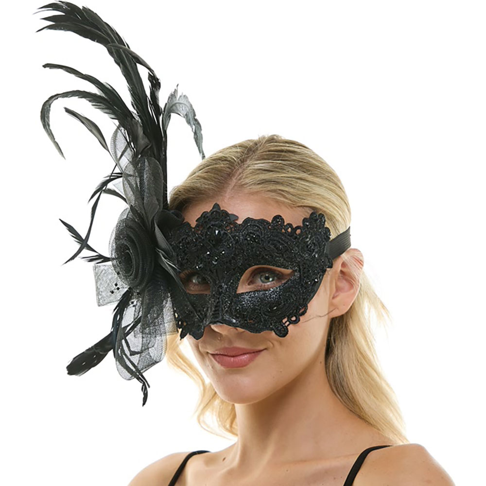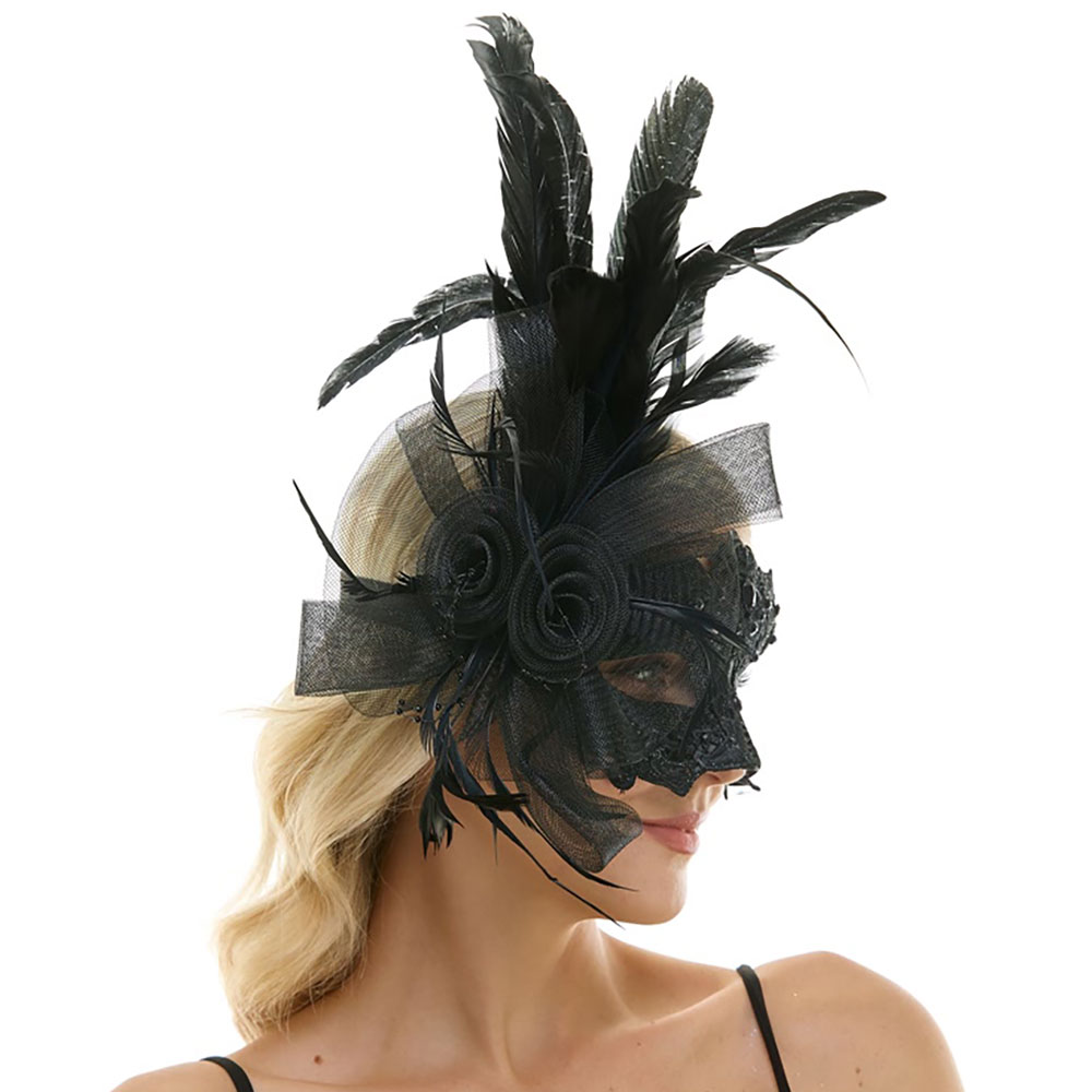 • Ornate lace masquerade mask adorned with dramatic feather plume and floral mesh detail. Perfect for costume parties, masquerade balls, or theatrical events. Comfortable and eye-catching design.