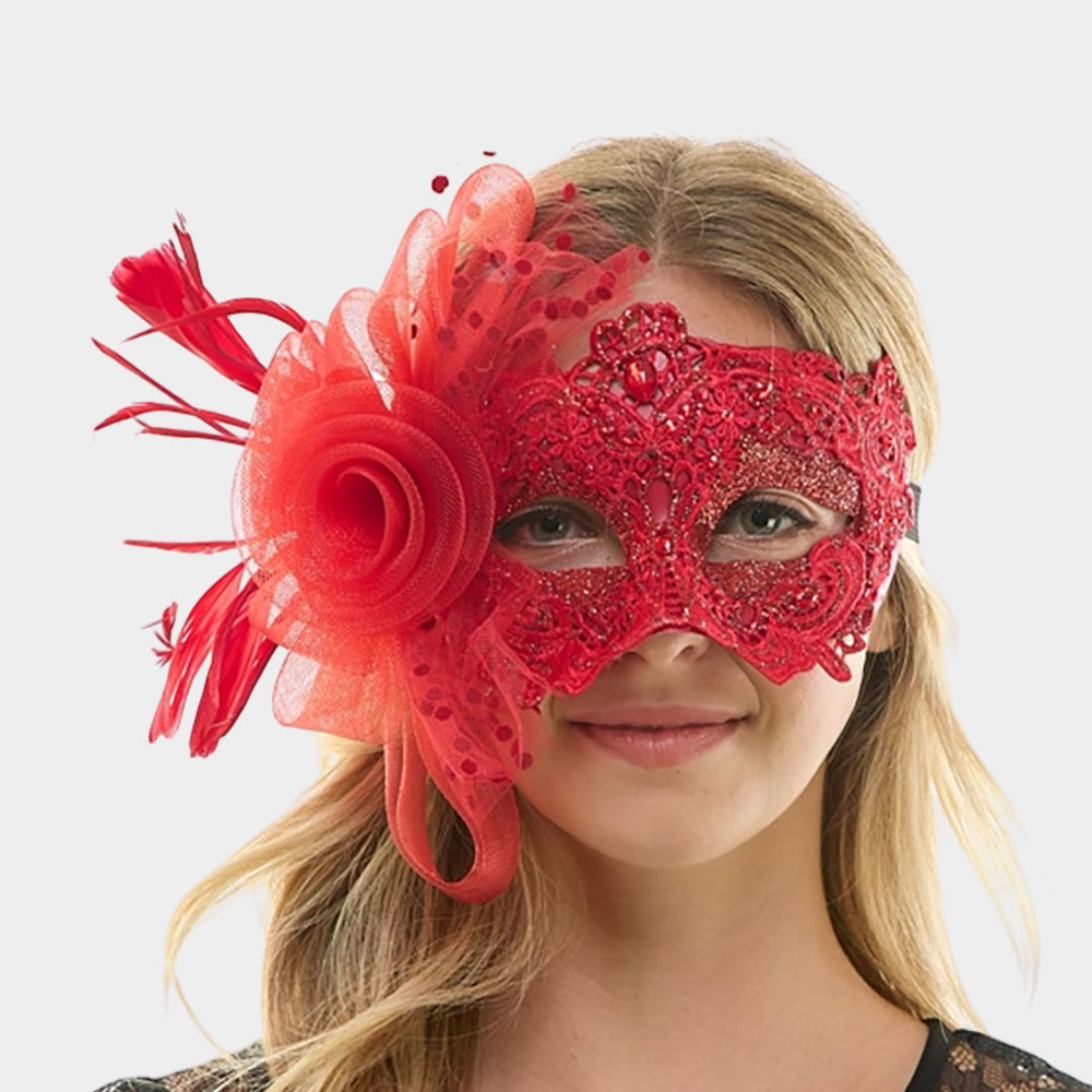 • Elegant masquerade mask adorned with lace, glitter details, and a dramatic tulle flower accent with feathers. Perfect for masquerade balls, costume events, and parties. Comfortable fit and style.