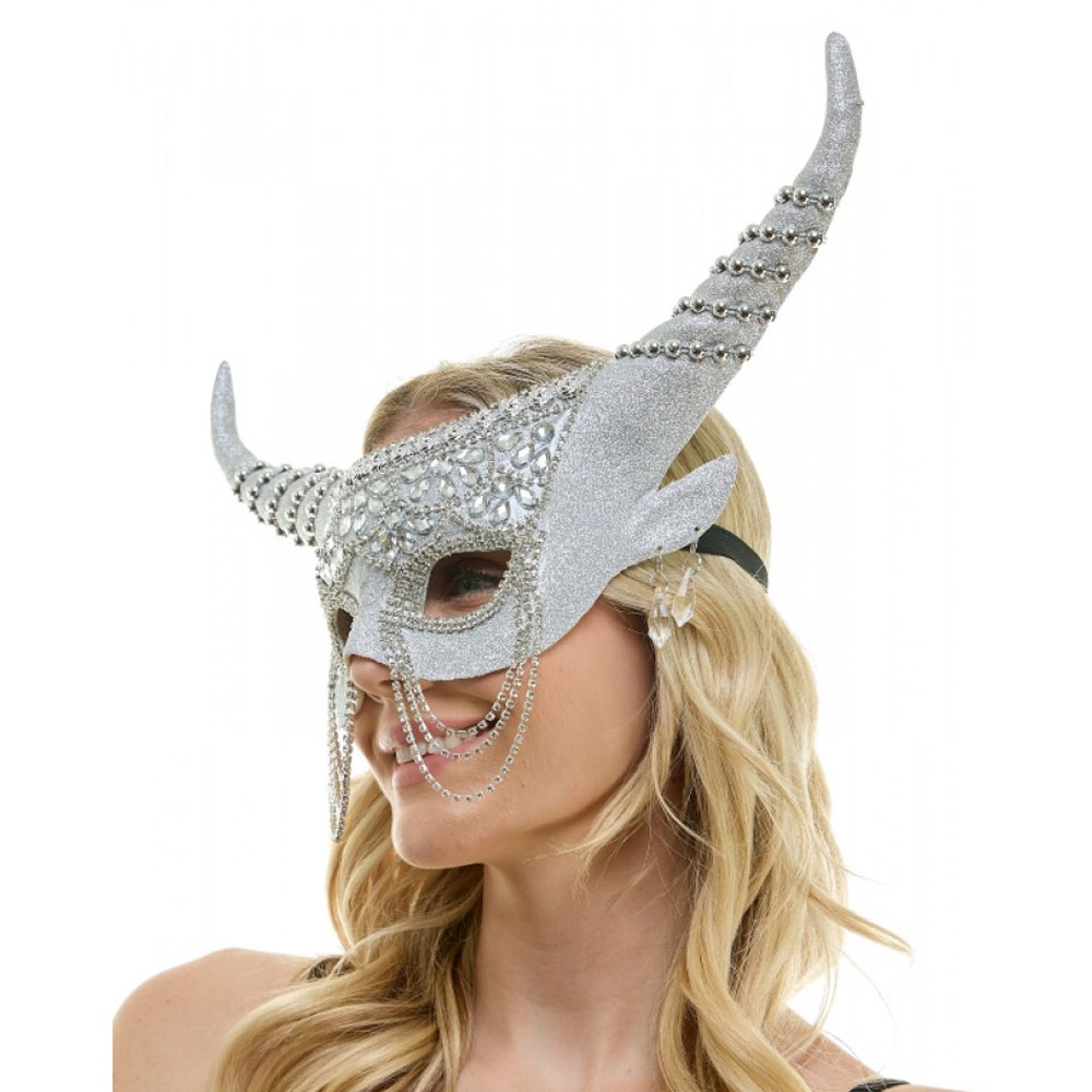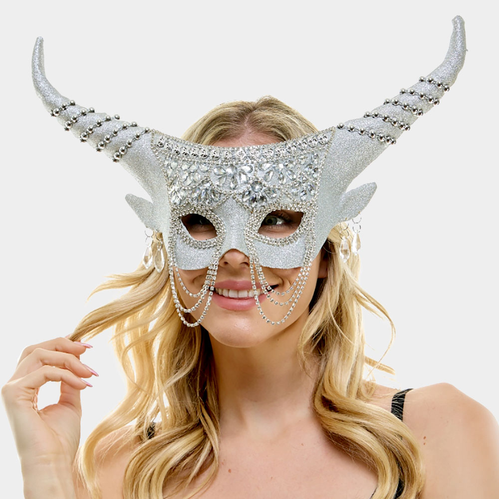 • Dazzle the crowd with this silver horned masquerade mask featuring rhinestones and chain accents. Ideal for fantasy costumes, masquerade balls, Halloween, and theatrical performances.