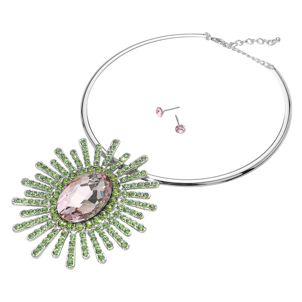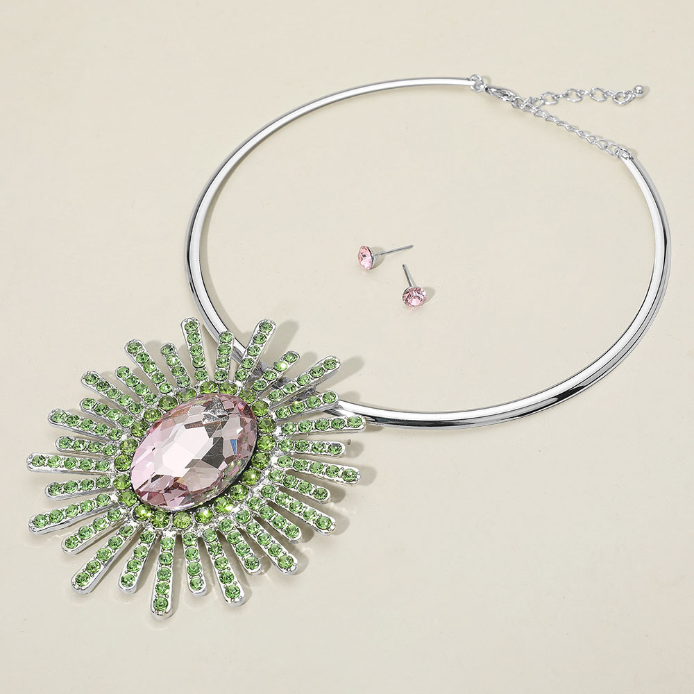 • Make a bold impression with this statement collar necklace featuring a radiant sunburst pendant encrusted with shimmering crystals and a brilliant central gem. Ideal for events and nights out where standout style is essential.