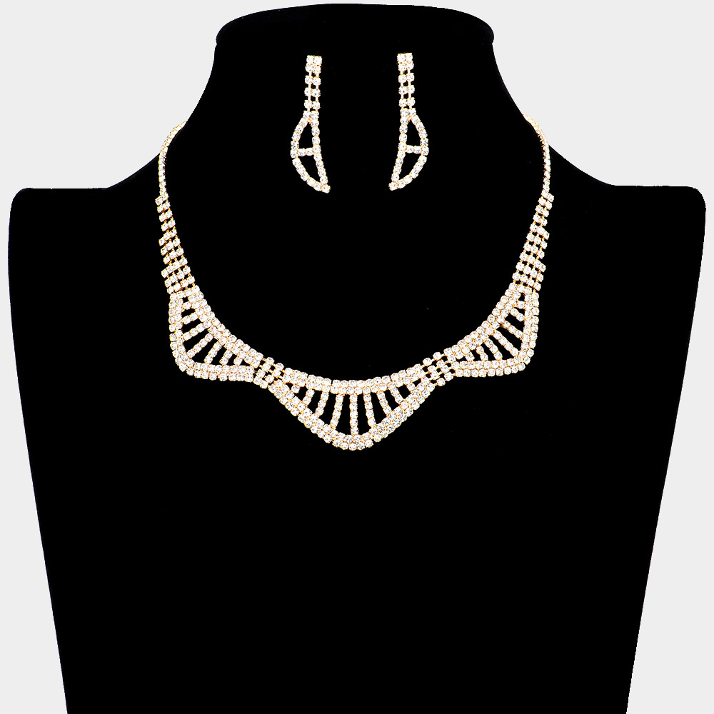 • Elevate your style with this crystal fan necklace and matching earrings set. Featuring a modern geometric design with sparkling stones, this elegant jewelry set is perfect for weddings, parties, and glamorous evening events.