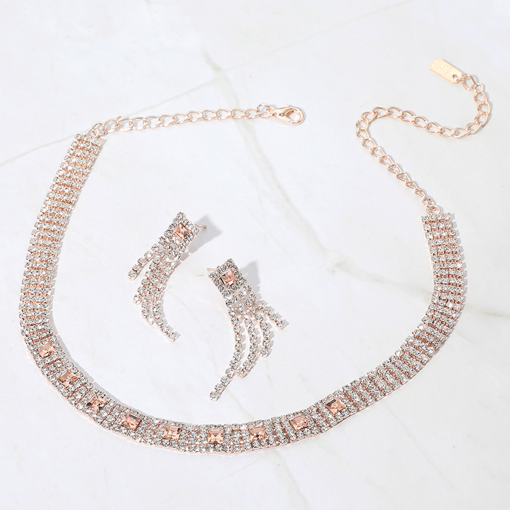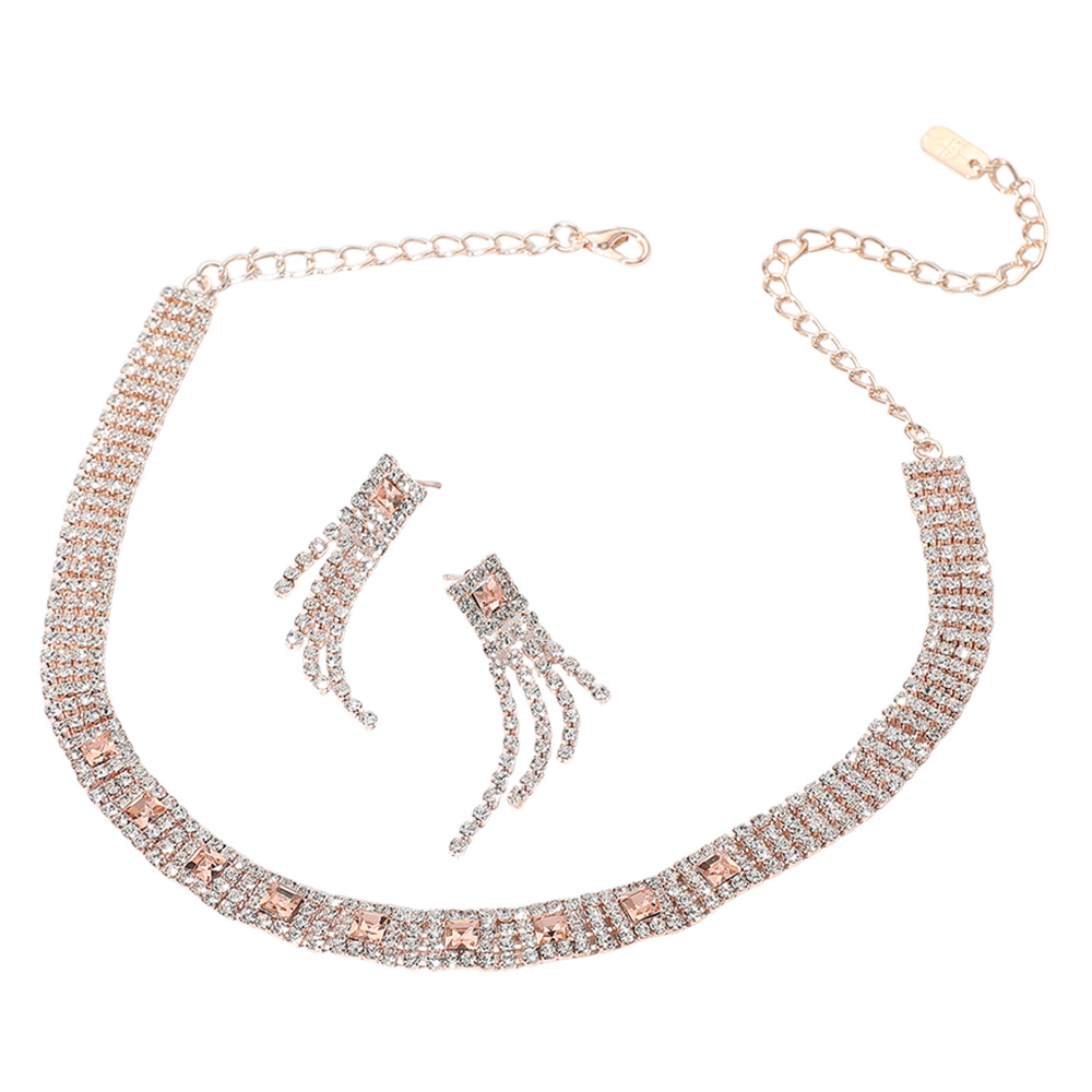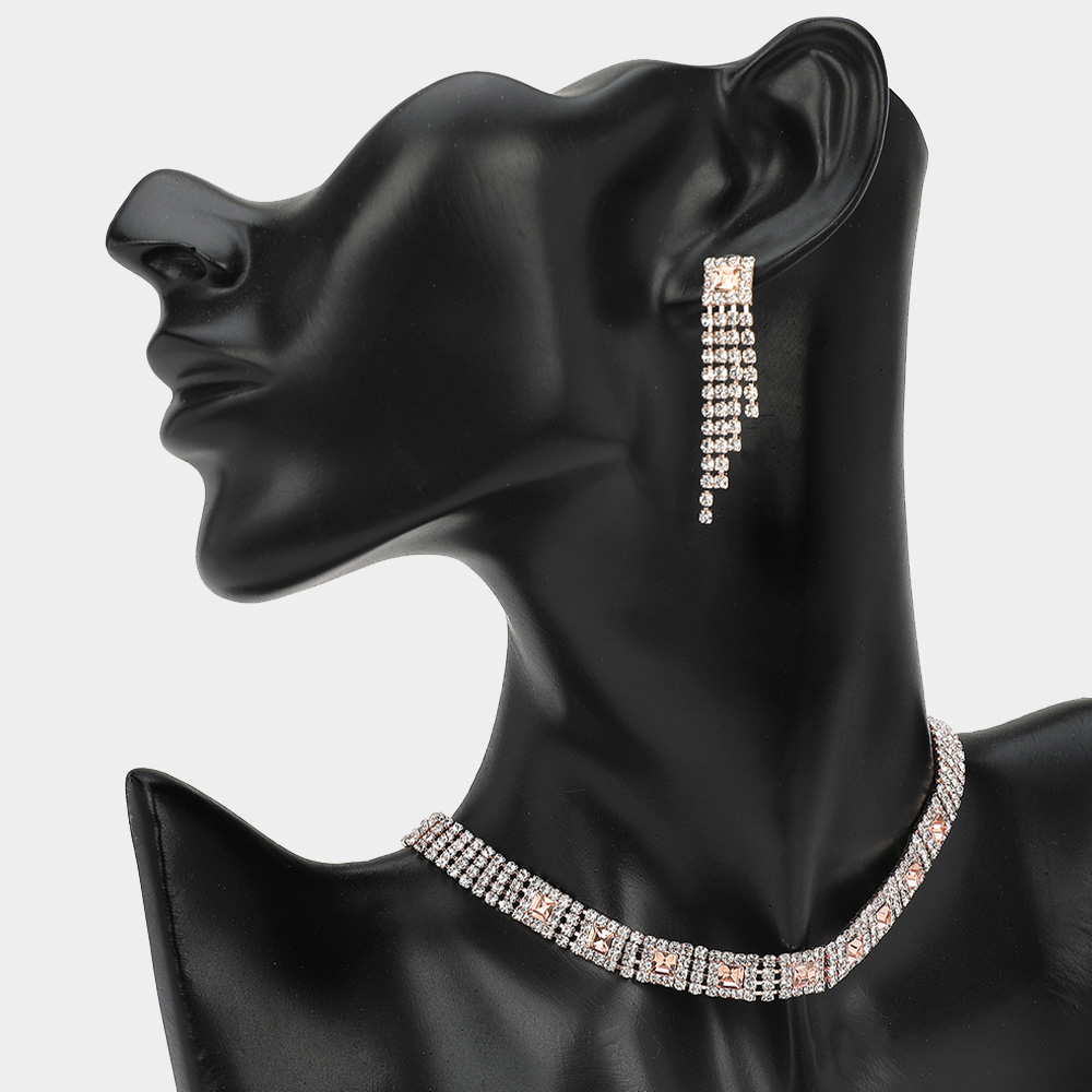 Details • Necklace Size : 13.5" + 4.5" L • Decor Size : 0.3" L • Earrings Size : 1.8" L • Turn heads with this rhinestone choker and earring set featuring shimmering strands and square accent stones. Designed for elegant evenings, parties, or special occasions, this coordinated set delivers striking sparkle and a refined touch to any glamorous ensemble.