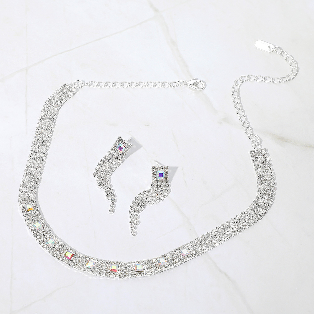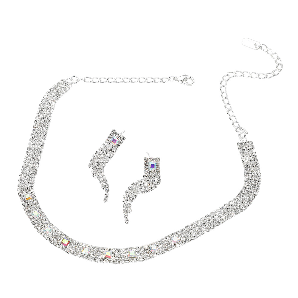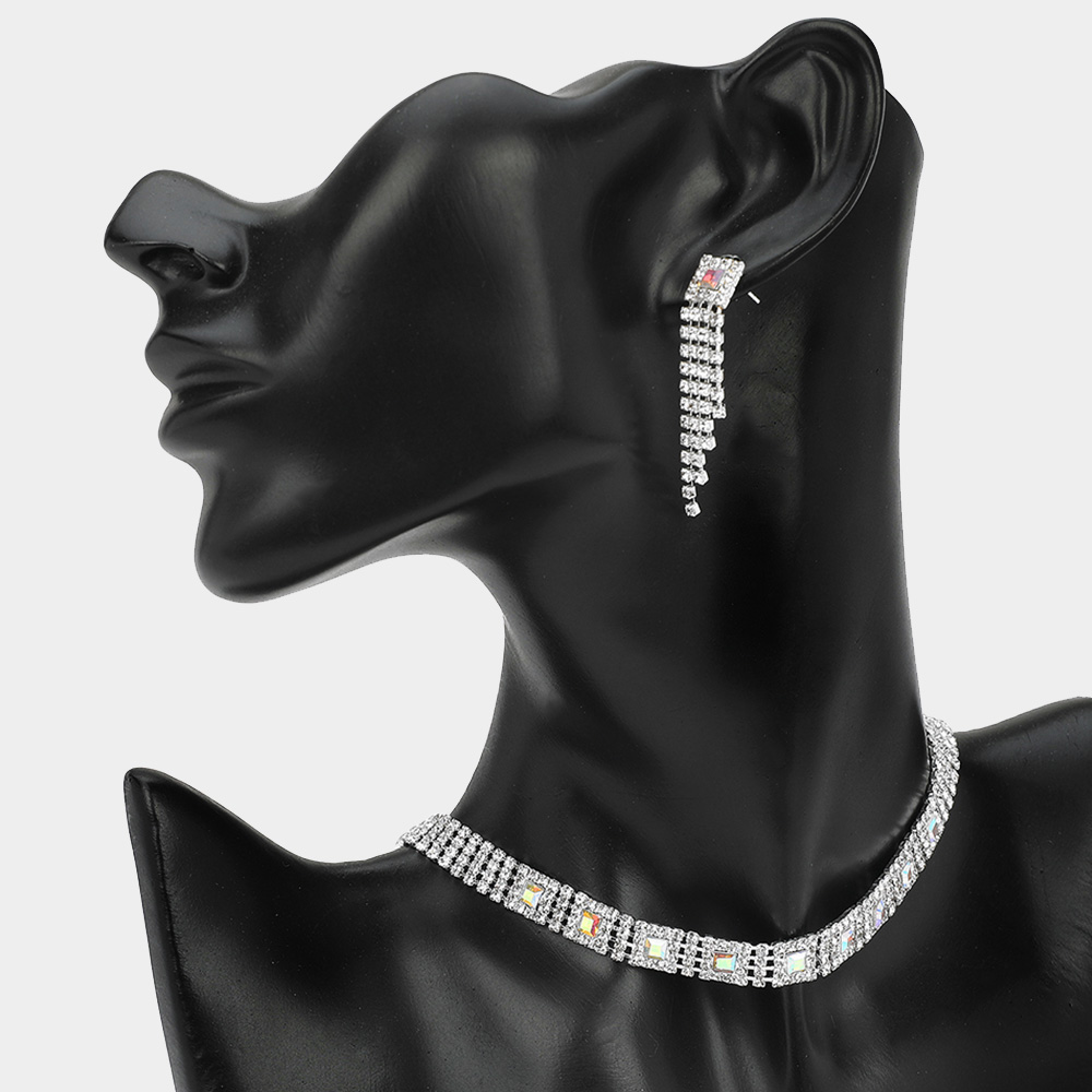 • Turn heads with this rhinestone choker and earring set featuring shimmering strands and square accent stones. Designed for elegant evenings, parties, or special occasions, this coordinated set delivers striking sparkle and a refined touch to any glamorous ensemble.