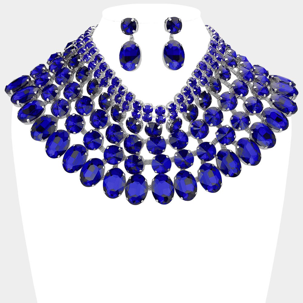 • Dramatic bib necklace and earring set featuring layered oval stones arranged in a bold cascading design. Perfect for weddings, galas, performances or any occasion that calls for standout glamour. An eye-catching accessory set that elevates formal and evening looks.