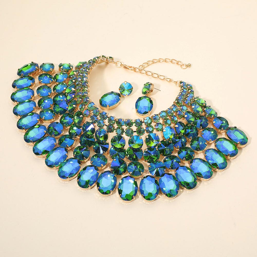 • Dramatic bib necklace and earring set featuring layered oval stones arranged in a bold cascading design. Perfect for weddings, galas, performances or any occasion that calls for standout glamour. An eye-catching accessory set that elevates formal and evening looks.