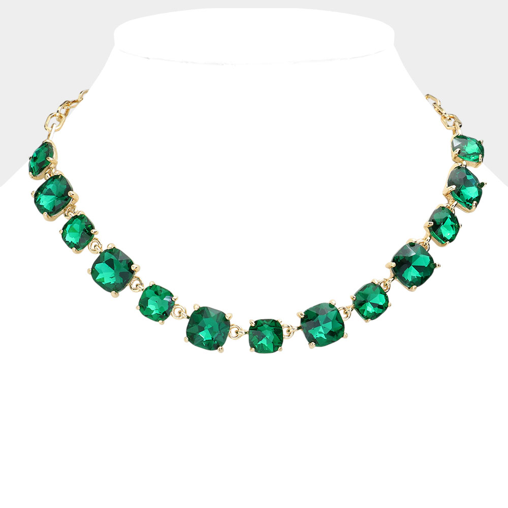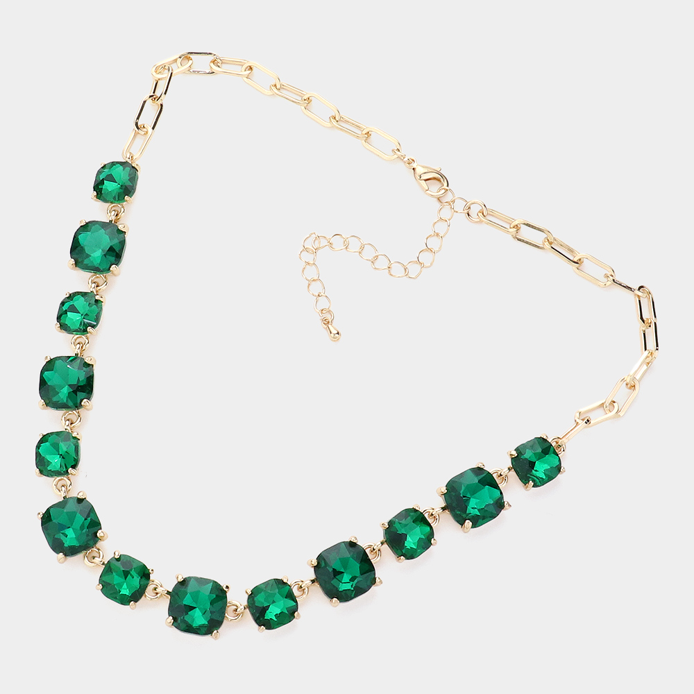 Details • Necklace Size : 16" + 2.75" L • Decor Size : 0.5" L • Elevate your style with this stunning square cut gemstone statement necklace. Featuring shimmering faceted stones linked in a classic design, it offers a chic adjustable fit. Perfect for evening wear, weddings, parties, or adding a sophisticated sparkle to your everyday look. • Lead and Nickel Compliant