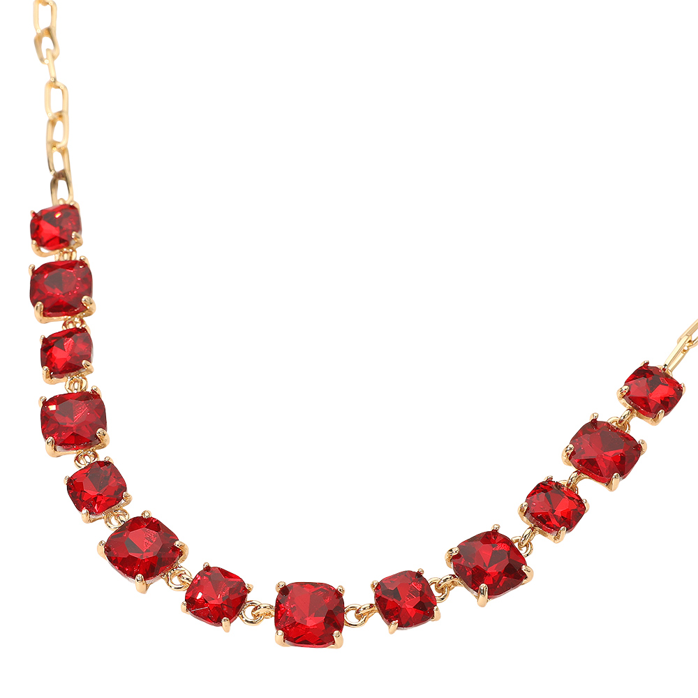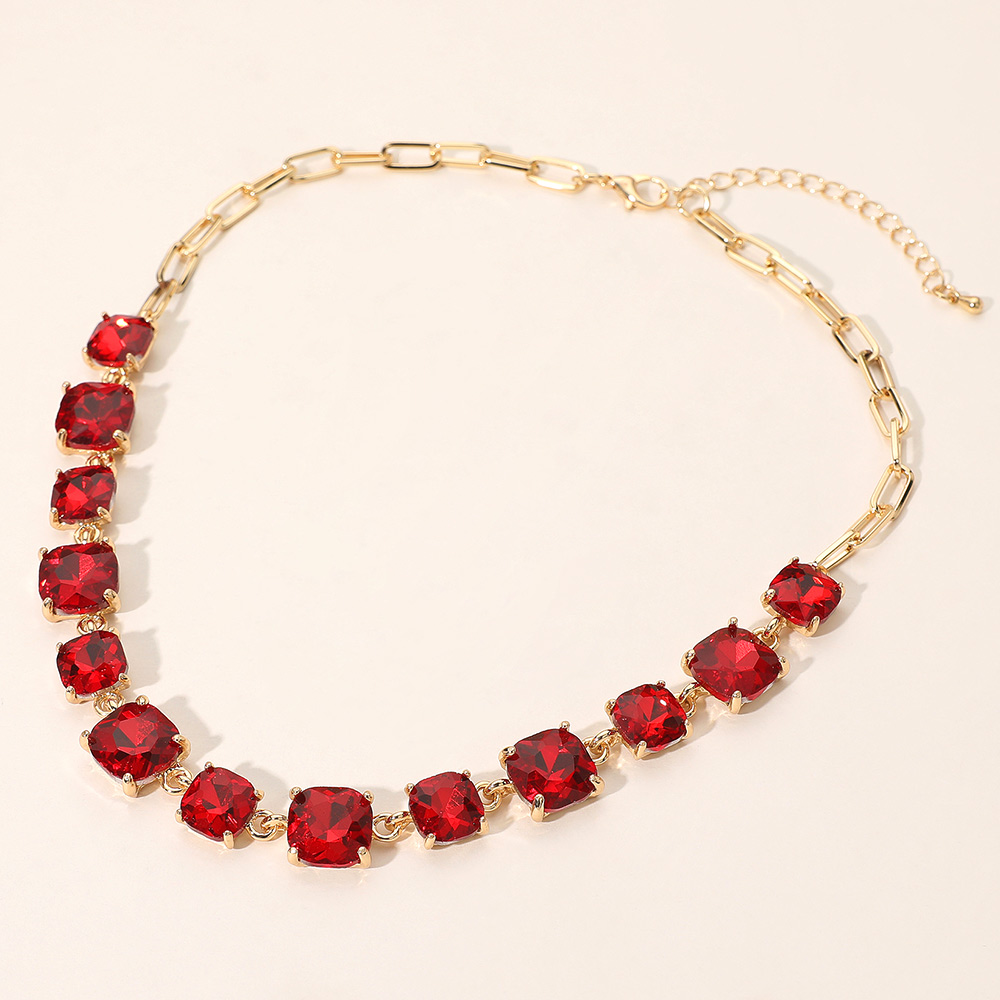 Details • Necklace Size : 16" + 2.75" L • Decor Size : 0.5" L • Elevate your style with this stunning square cut gemstone statement necklace. Featuring shimmering faceted stones linked in a classic design, it offers a chic adjustable fit. Perfect for evening wear, weddings, parties, or adding a sophisticated sparkle to your everyday look. • Lead and Nickel Compliant
